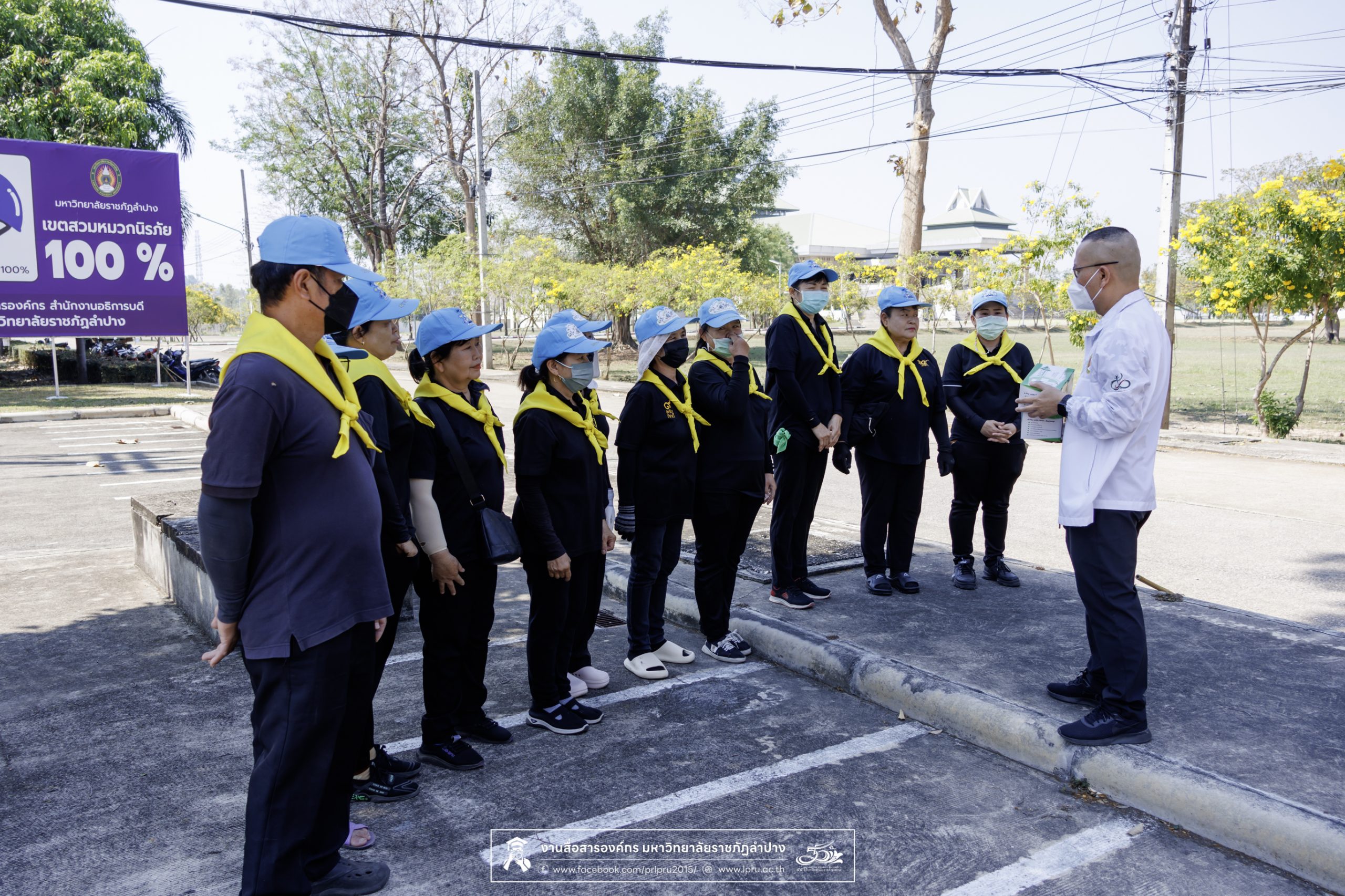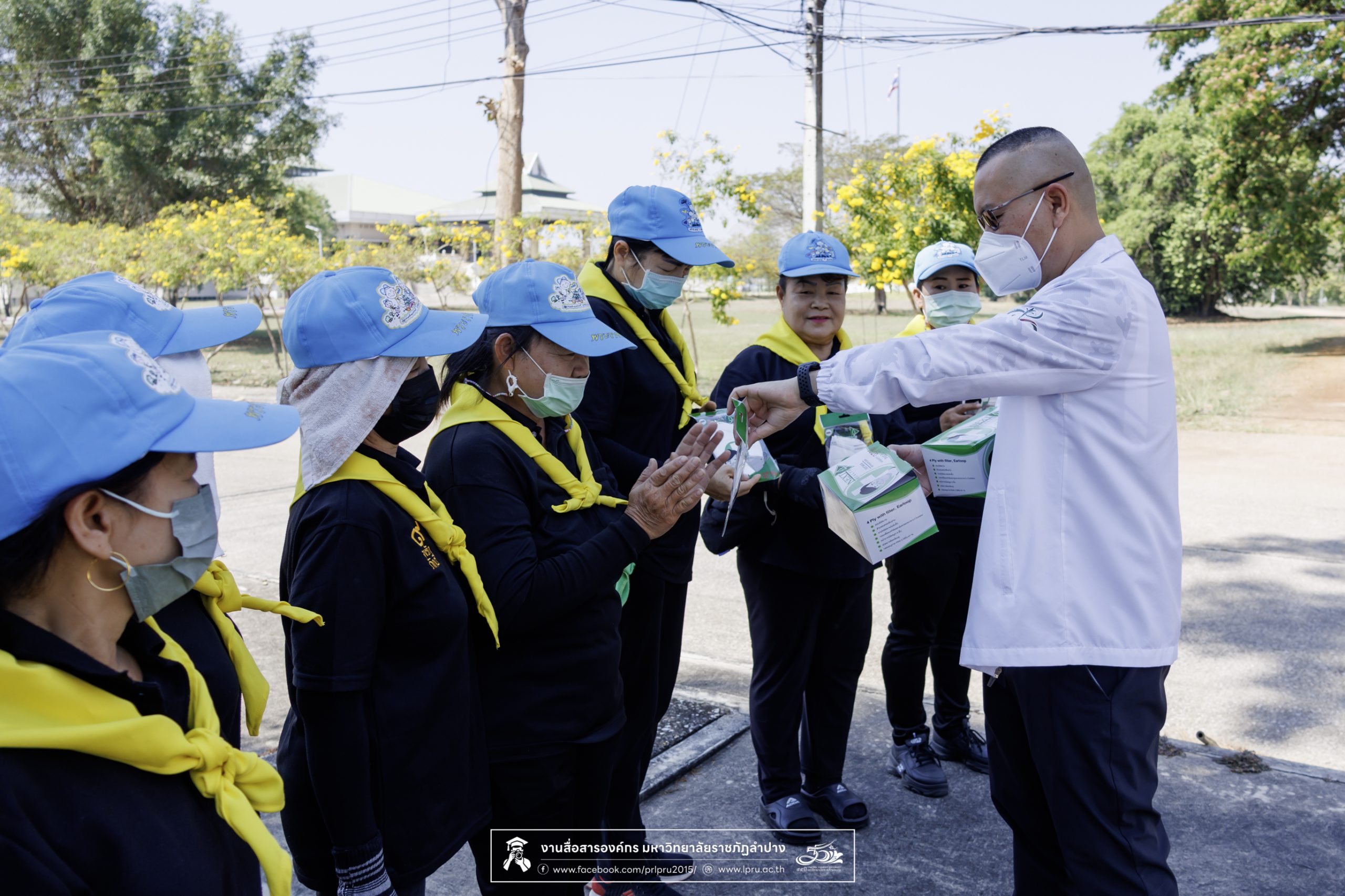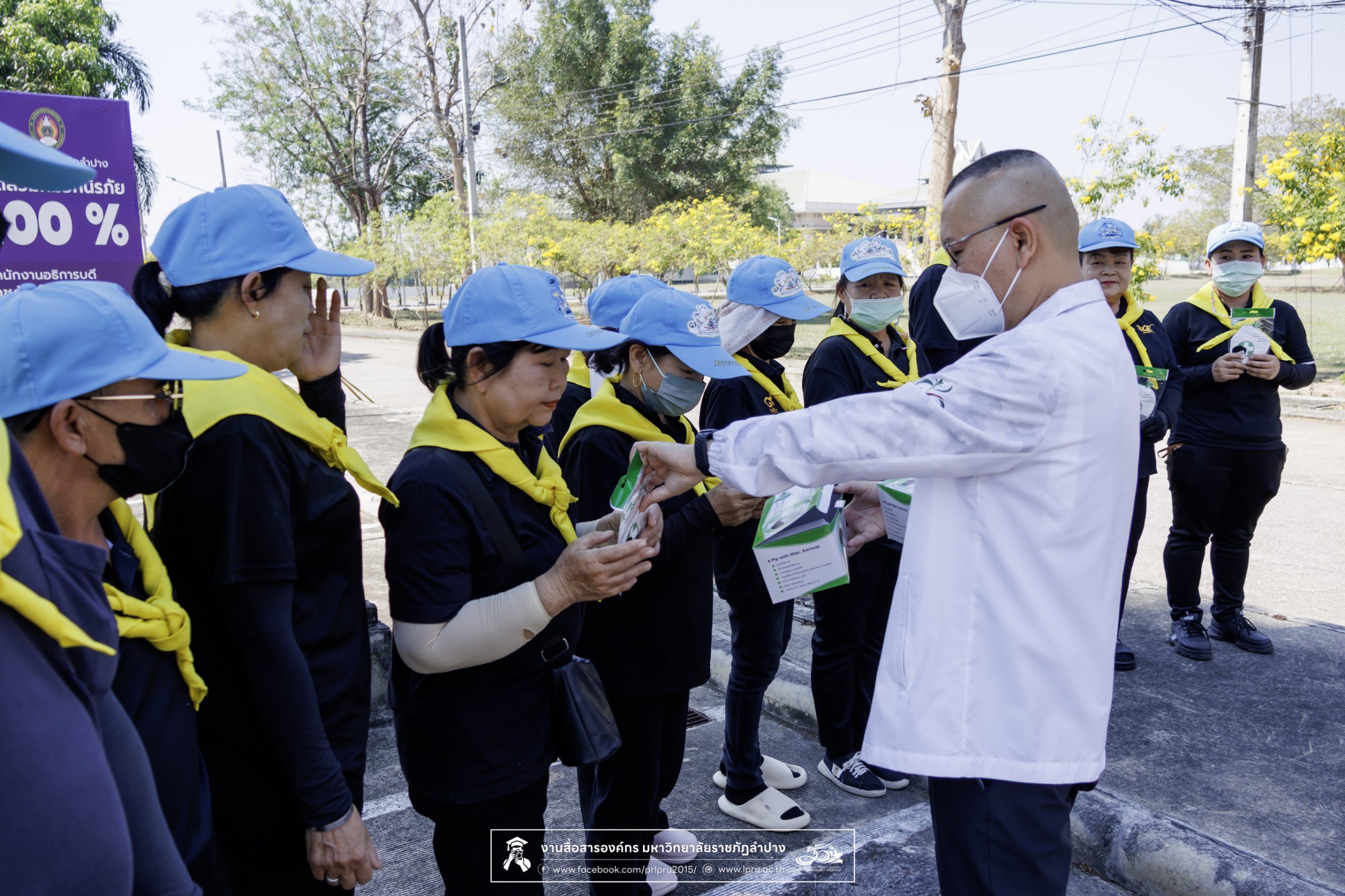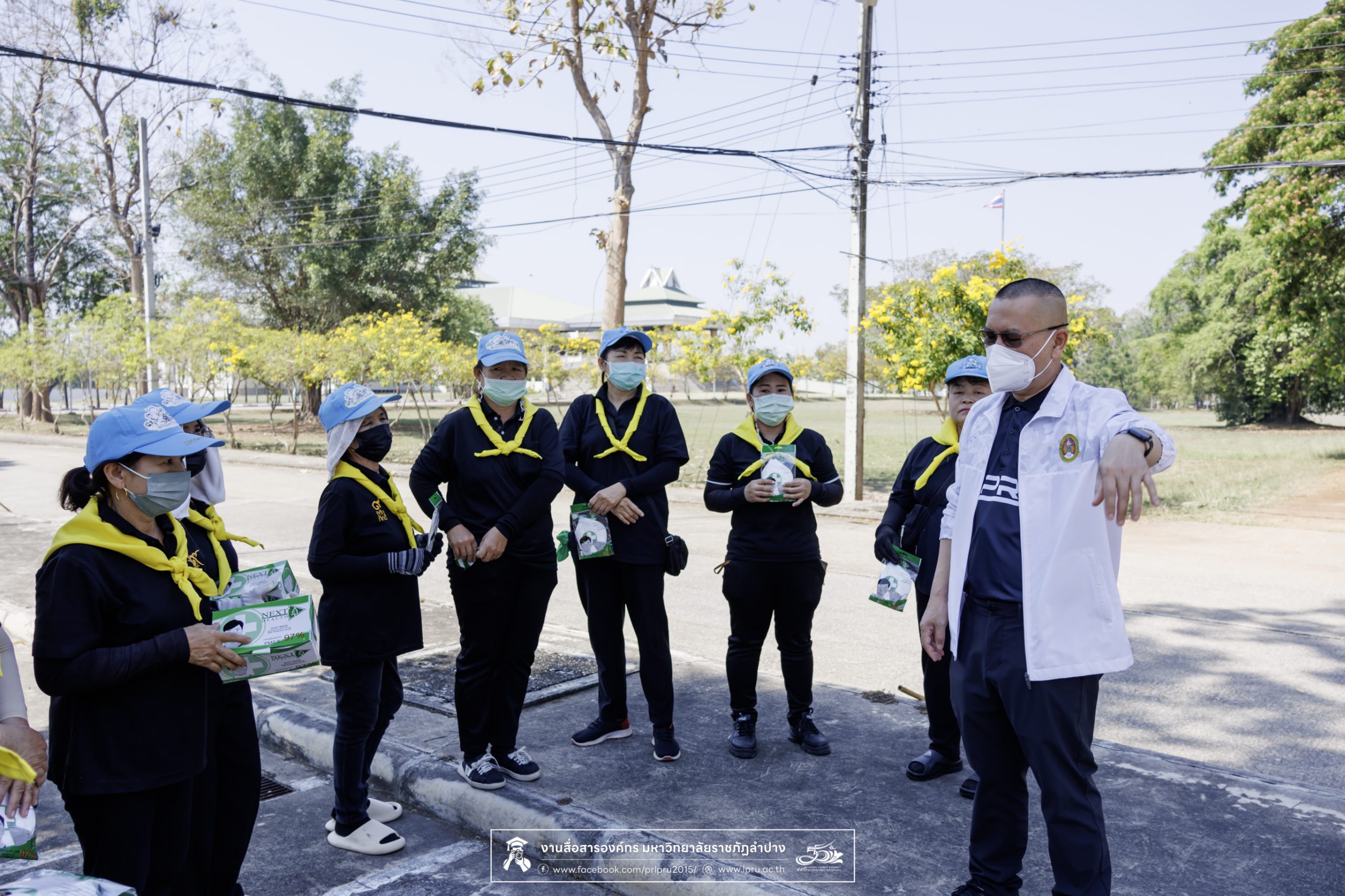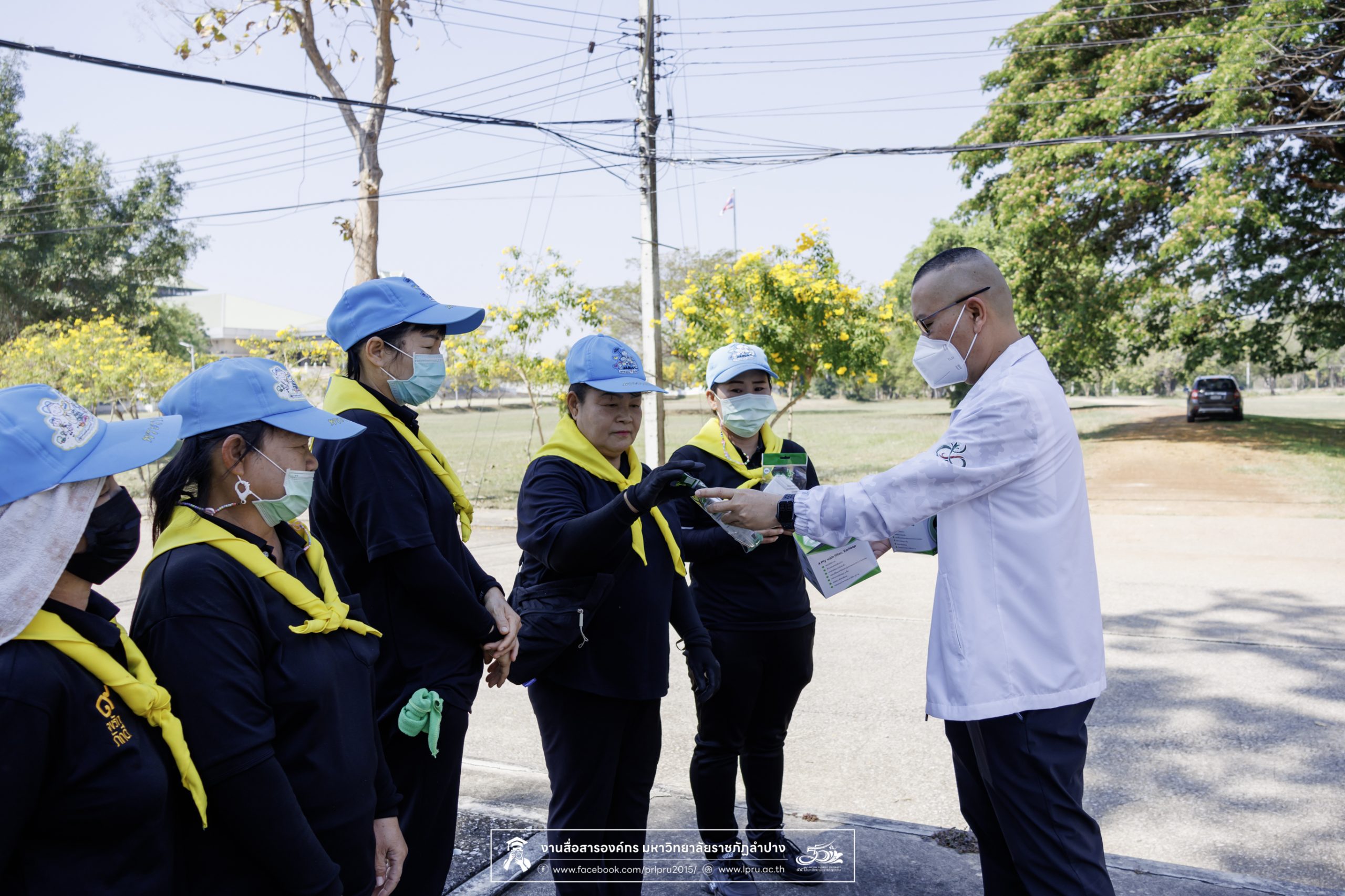 รศ.ดร.ปริเยศ สิทธิสรวง รองอธิการบดีฝ่ายบริหาร มหาวิทยาลัยราชภัฏลำปาง ร่วมตรวจเยี่ยมการจัดกิจกรรมจิตอาสา และแจกหน้ากากอนามัยป้องกันฝุ่น PM 2.5 ให้กับแม่บ้าน เจ้าหน้าที่ภาคสนาม และผู้ปฏิบัติงานในสถานที่โล่งแจ้ง เมื่อวันที่ 20 มีนาคม 2569 ณ บริเวณด้านหลังอาคารสำนักงานอธิการบดี มหาวิทยาลัยราชภัฏลำปาง