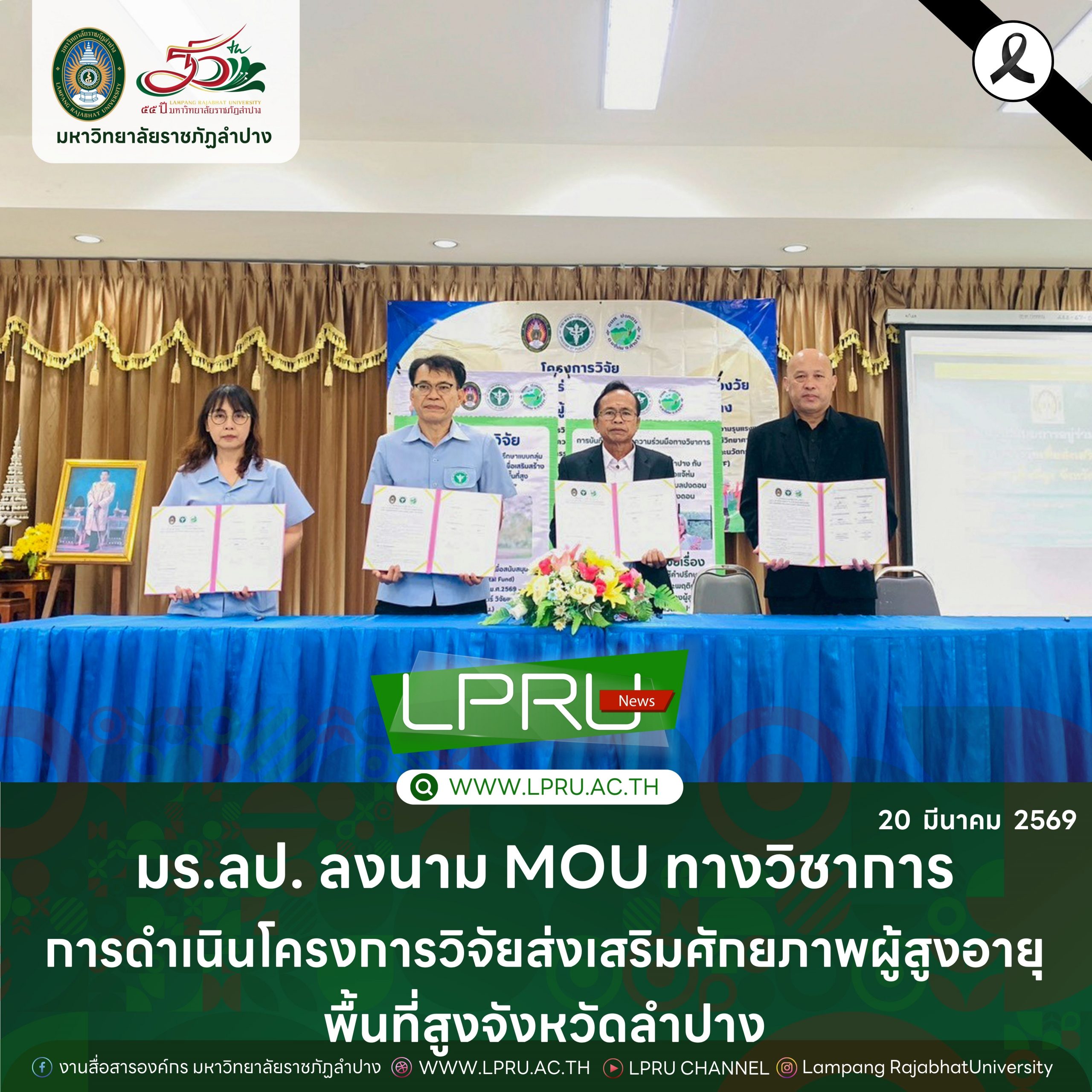 รศ.ปริตต์ สายสี รองอธิการบดีฝ่ายกิจการนักศึกษา มหาวิทยาลัยราชภัฏลำปาง ร่วมลงนามบันทึกข้อตกลงความร่วมมือทางวิชาการ ในการส่งเสริมและสนับสนุนการขับเคลื่อนการพัฒนารูปแบบการอยู่ร่วมกันในสังคมของคนทุกช่วงวัยเพื่อส่งเสริมศักยภาพผู้สูงอายุพื้นที่สูงจังหวัดลำปาง ซึ่งเป็นส่วนหนึ่งของโครงการวิจัยเรื่อง “การพัฒนารูปแบบการอยู่ร่วมกันในสังคมของคนทุกช่วงวัยเพื่อส่งเสริมศักยภาพผู้สูงอายุพื้นที่สูงจังหวัดลำปาง” และ “การพัฒนาโปรแกรมการให้คำปรึกษาแบบกลุ่มตามทฤษฎีการรู้คิดและพฤติกรรมเพื่อเสริมสร้างสุขภาวะทางจิตของผู้สูงอายุพื้นที่สูง อำเภอแจ้ห่ม จังหวัดลำปาง” ร่วมกับนายสุพล ปัญญาไว สาธารณสุขอำเภอแจ้ห่ม สำนักงานสาธารณสุขอำเภอแจ้ห่ม นางเนตรดาว มีธรรม ผู้อำนวยการโรงพยาบาลส่งเสริมสุขภาพตำบลปงดอน และนายไตรโรจน์ พิพัฒธนะมงคล นายกองค์การบริหารส่วนตำบลปงดอน อำเภอแจ้ห่ม จังหวัดลำปาง ผศ.ดร.ปณตนนท์ เถียรประภากุล รองผู้อำนวยการสถาบันวิจัยและพัฒนา และ อ.ดร.วิมพ์วิภา บุญกลิ่น อาจารย์สังกัดสาขาวิชาจิตวิทยาการศึกษาและการแนะแนว คณะครุศาสตร์ ในฐานะหัวหน้าโครงการวิจัยร่วมลงนามเป็นพยาน เมื่อวันที่ 19 มีนาคม 2569 ณ องค์การบริหารส่วนตำบลปงดอน อำเภอแจ้ห่ม จังหวัดลำปาง ในการนี้มี ผศ.ดร.ฉัตรสุดา มาทา รองผู้อำนวยการสถาบันวิจัยและพัฒนา อ.ดร.ปณิสรา จันทร์ปาละ อาจารย์สังกัดสาขาวิชาหลักสูตรและการสอน ผศ.อภิรดี จีนคร้าม อาจารย์สังกัดสาขาวิชาภาษาอังกฤษ อ.อิสสริยภรณ์ วานิชพิพัฒน์ อาจารย์สังกัดสาขาวิชาการประถมศึกษา และ ผศ.เศรษฐวิชญ์ ชโนวรรณ อาจารย์สังกัดสาขาวิชาการวิจัยและประเมินผลทางการศึกษา คณะครุศาสตร์ ในฐานะนักวิจัยร่วมเป็นเกียรติในพิธีลงนามความร่วมมือในครั้งนี้