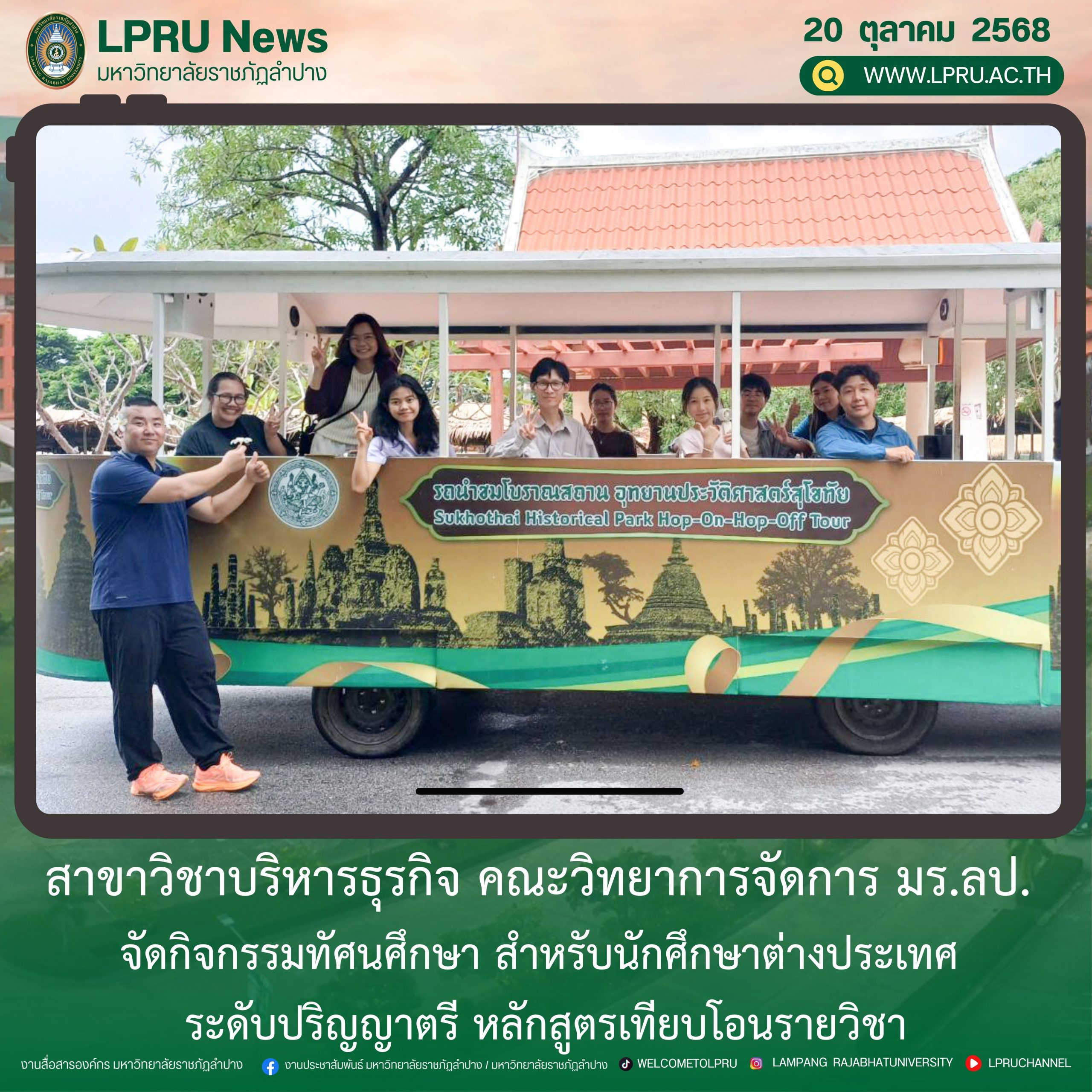 อ.ดร.นุสรา แสงอร่าม คณบดีคณะวิทยาการจัดการ พร้อมด้วย อ.ชิดชนก วงศ์เครือ อาจารย์สังกัดสาขาวิชาบริหารธุรกิจ คณะวิทยาการจัดการ และนายธนวัฒน์ แต้คำ บุคลากรสังกัดงานบริหารทั่วไป คณะวิทยาการจัดการ จัดกิจกรรมทัศนศึกษา สำหรับนักศึกษาต่างประเทศ ระดับปริญญาตรี หลักสูตรเทียบโอนรายวิชา เมื่อวันที่ 15 ตุลาคม 2568 ณ อุทยานประวัติศาสตร์สุโขทัย จังหวัดสุโขทัย