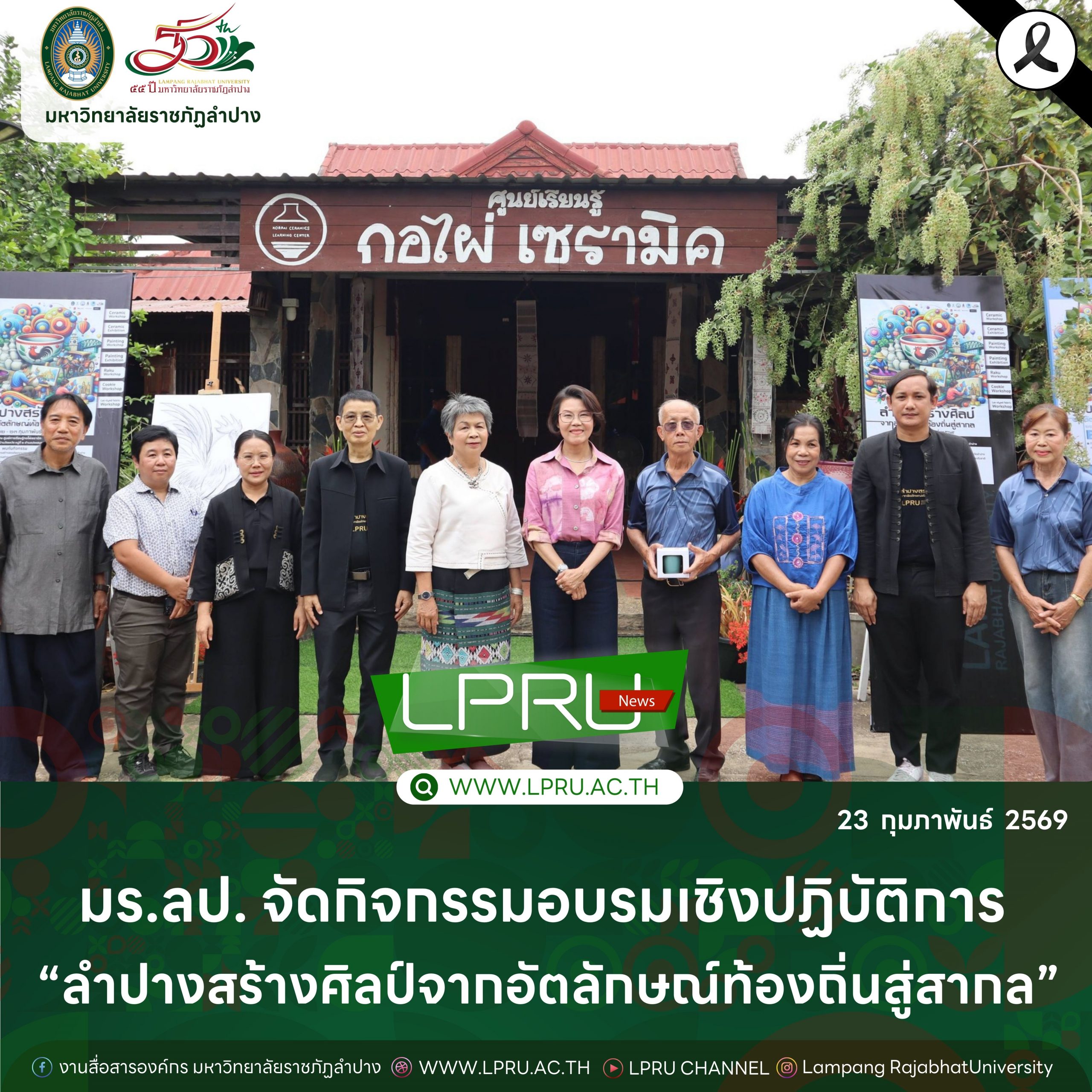 เมื่อวันที่ 22 กุมภาพันธ์ 2569 สำนักศิลปะและวัฒนธรรม มหาวิทยาลัยราชภัฏลำปาง จัดกิจกรรมอบรมเชิงปฏิบัติการ “ลำปางสร้างศิลป์จากอัตลักษณ์ท้องถิ่นสู่สากล” ณ ศูนย์เรียนรู้กอไผ่เซรามิก บ้านวังแคว้ง ตำบลปงแสนทอง อำเภอเมือง จังหวัดลำปาง โดยได้รับเกียรติจาก น.ส.ตวงรัตน์ โล่ห์สุนทร นายกองค์การบริหารส่วนจังหวัดลำปาง เป็นประธานพิธีเปิด นายพศิน ทาฟู ผู้ก่อตั้งศูนย์เรียนรู้กอไผ่เซรามิก กล่าวต้อนรับ ซึ่งมีผู้สนใจเข้าร่วมกิจกรรมอบรมกว่า 200 คน