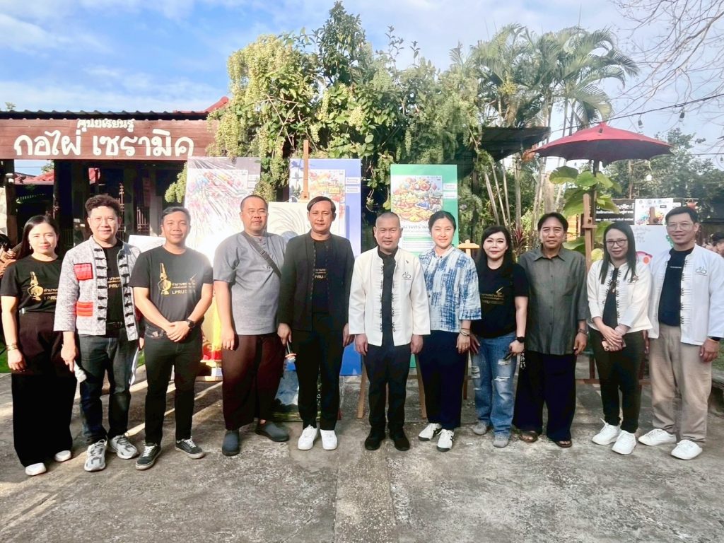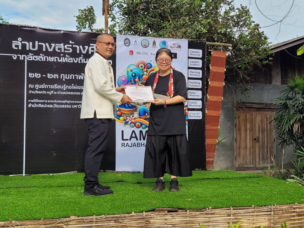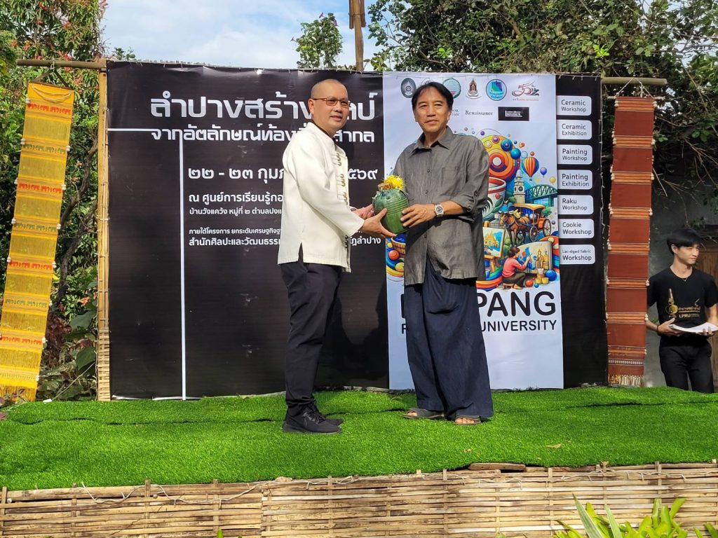 เมื่อวันที่ 22 กุมภาพันธ์ 2569 รศ.ดร.ปริเยศ สิทธิสรวงรองอธิการบดีฝ่ายบริหาร มหาวิทยาลัยราชภัฏลำปาง เป็นประธานพิธีเปิดนิทรรศการกิจกรรมอบรมเชิงปฏิบัติการ “ลำปางสร้างศิลป์จากอัตลักษณ์ท้องถิ่นสู่สากล” ณ ศูนย์เรียนรู้กอไผ่เซรามิก บ้านวังแคว้ง ตำบลปงแสนทอง อำเภอเมือง จังหวัดลำปาง โดย ผศ.เจษฎา ทองสุข ผู้อำนวยการสำนักศิลปะและวัฒนธรรม มหาวิทยาลัยราชภัฏลำปาง กล่าวรายงานวัตถุประสงค์