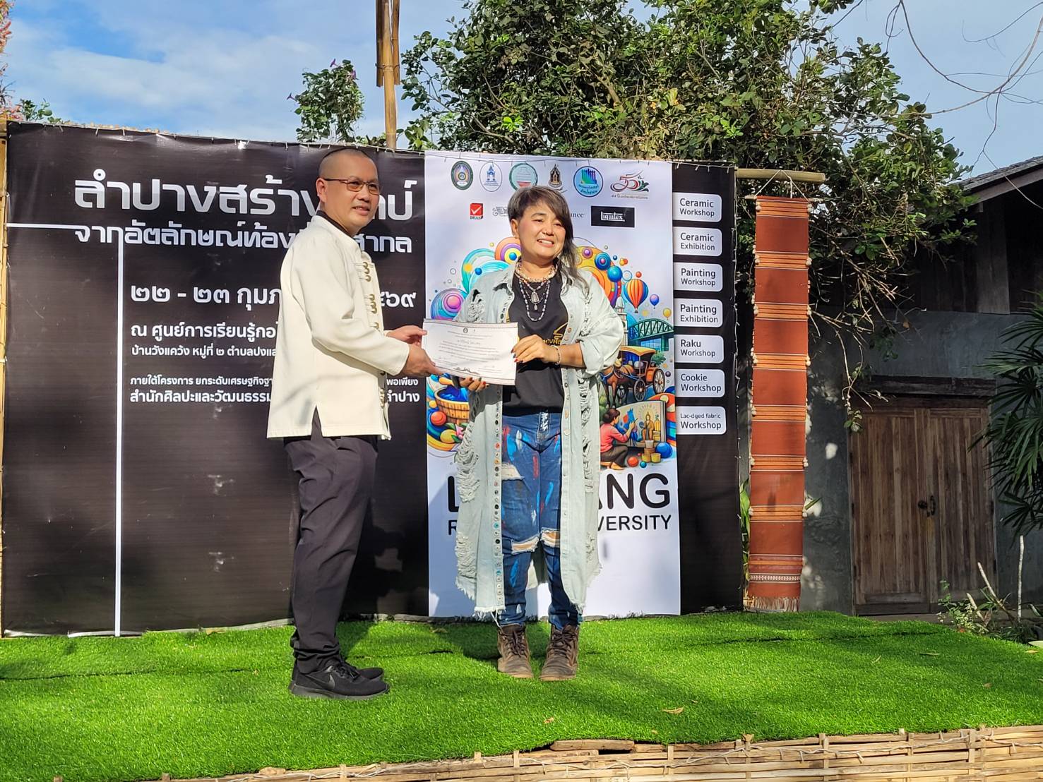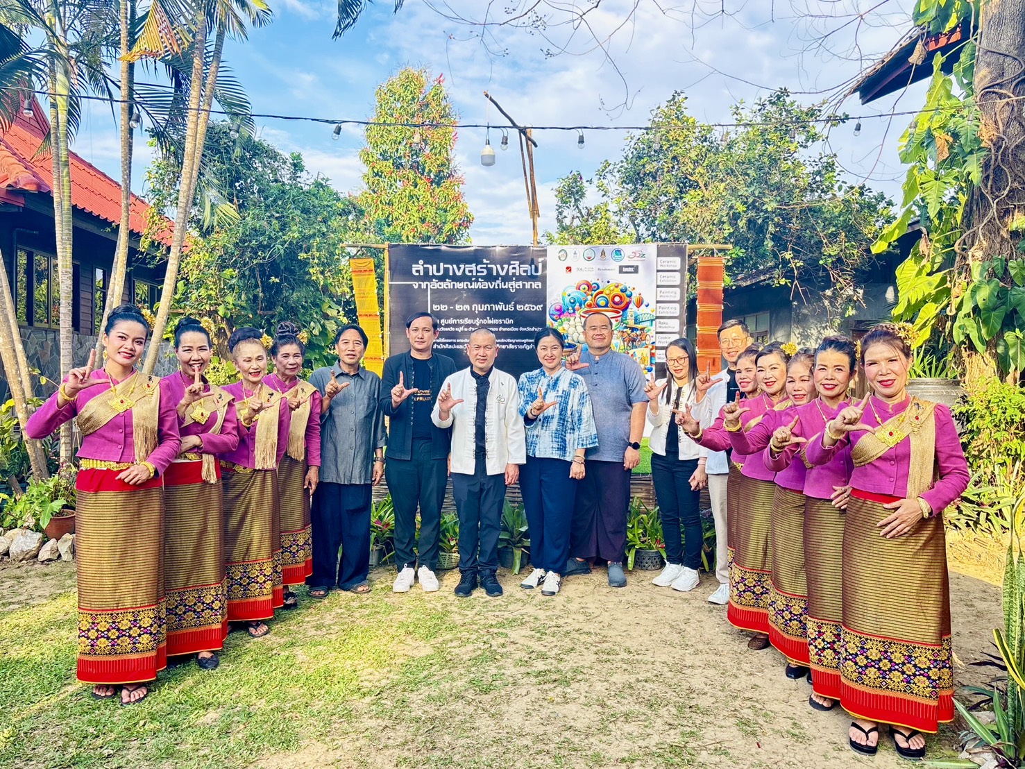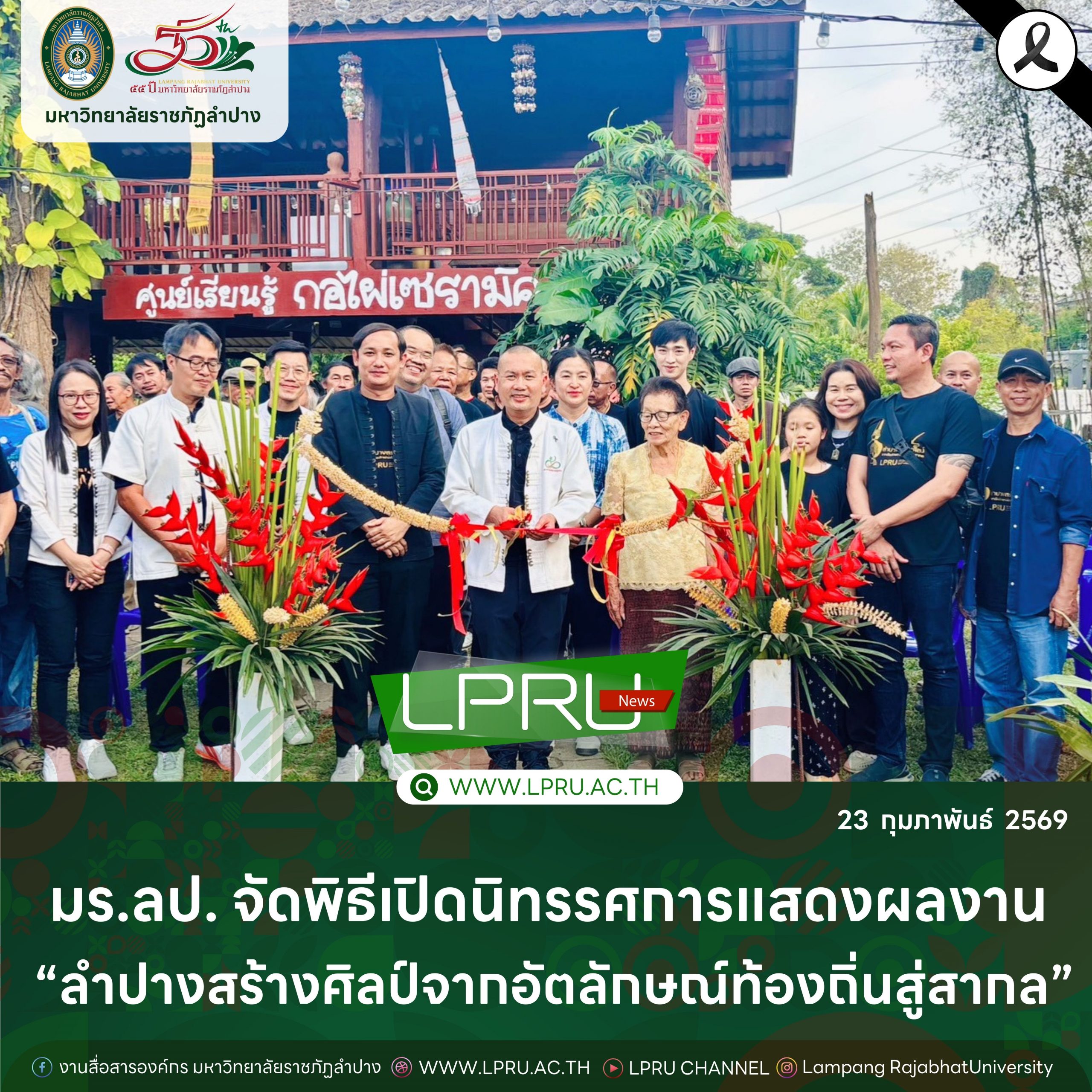 เมื่อวันที่ 22 กุมภาพันธ์ 2569 รศ.ดร.ปริเยศ สิทธิสรวงรองอธิการบดีฝ่ายบริหาร มหาวิทยาลัยราชภัฏลำปาง เป็นประธานพิธีเปิดนิทรรศการกิจกรรมอบรมเชิงปฏิบัติการ “ลำปางสร้างศิลป์จากอัตลักษณ์ท้องถิ่นสู่สากล” ณ ศูนย์เรียนรู้กอไผ่เซรามิก บ้านวังแคว้ง ตำบลปงแสนทอง อำเภอเมือง จังหวัดลำปาง โดย ผศ.เจษฎา ทองสุข ผู้อำนวยการสำนักศิลปะและวัฒนธรรม มหาวิทยาลัยราชภัฏลำปาง กล่าวรายงานวัตถุประสงค์
