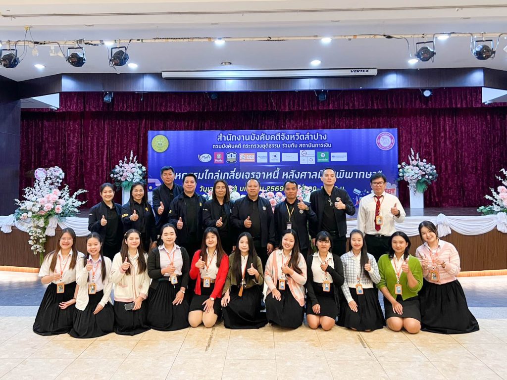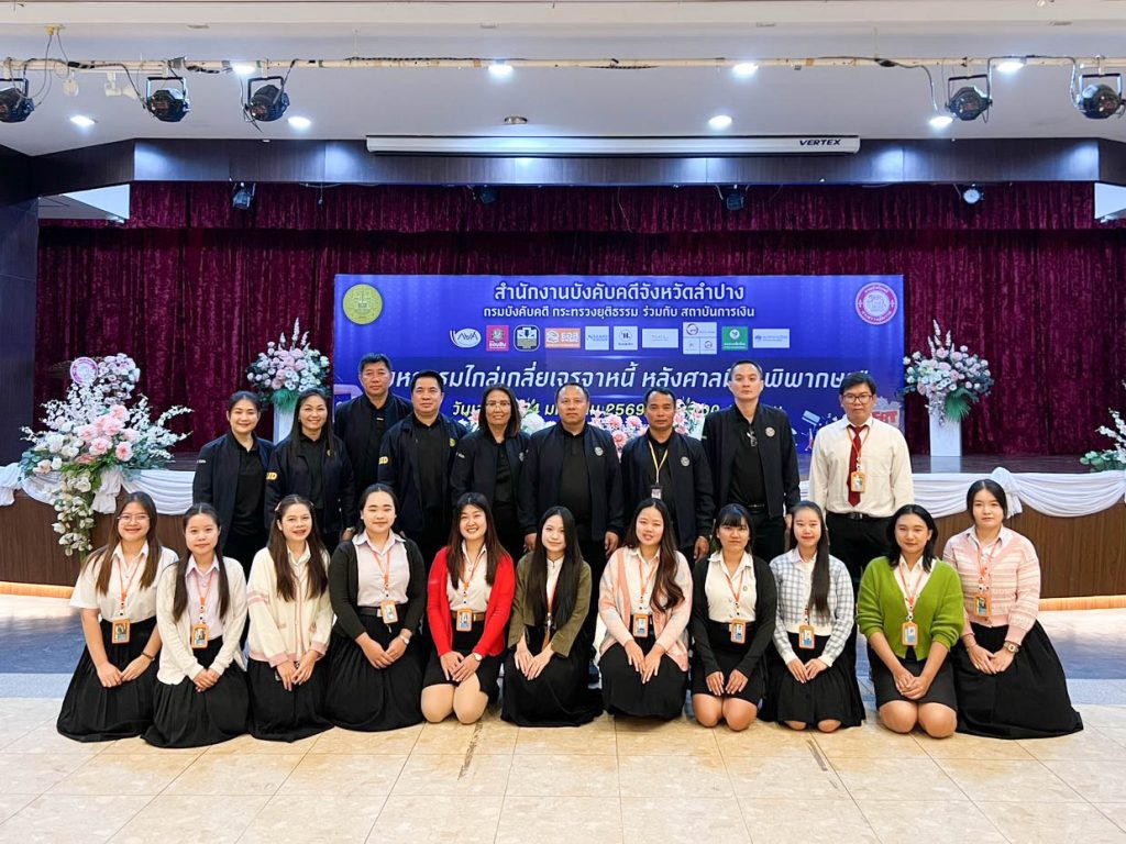 ผศ.อัคจร บุปผาจำเริญ รองคณบดีคณะมนุษยศาสตร์และสังคมศาสตร์ มหาวิทยาลัยราชภัฏลำปาง เปิดเผยว่า เมื่อวันที่ 24 มกราคม 2569 นักศึกษาหลักสูตรนิติศาสตรบัณฑิต ชั้นปีที่ 3 และปีที่ 4 คณะมนุษยศาสตร์และสังคมศาสตร์ เข้าร่วมสังเกตการณ์ในงานมหกรรมไกล่เกลี่ยเจรจาหนี้หลังศาลมีคำพิพากษา ณ หอประชุมจันทน์ มหาวิทยาลัยราชภัฏลำปาง