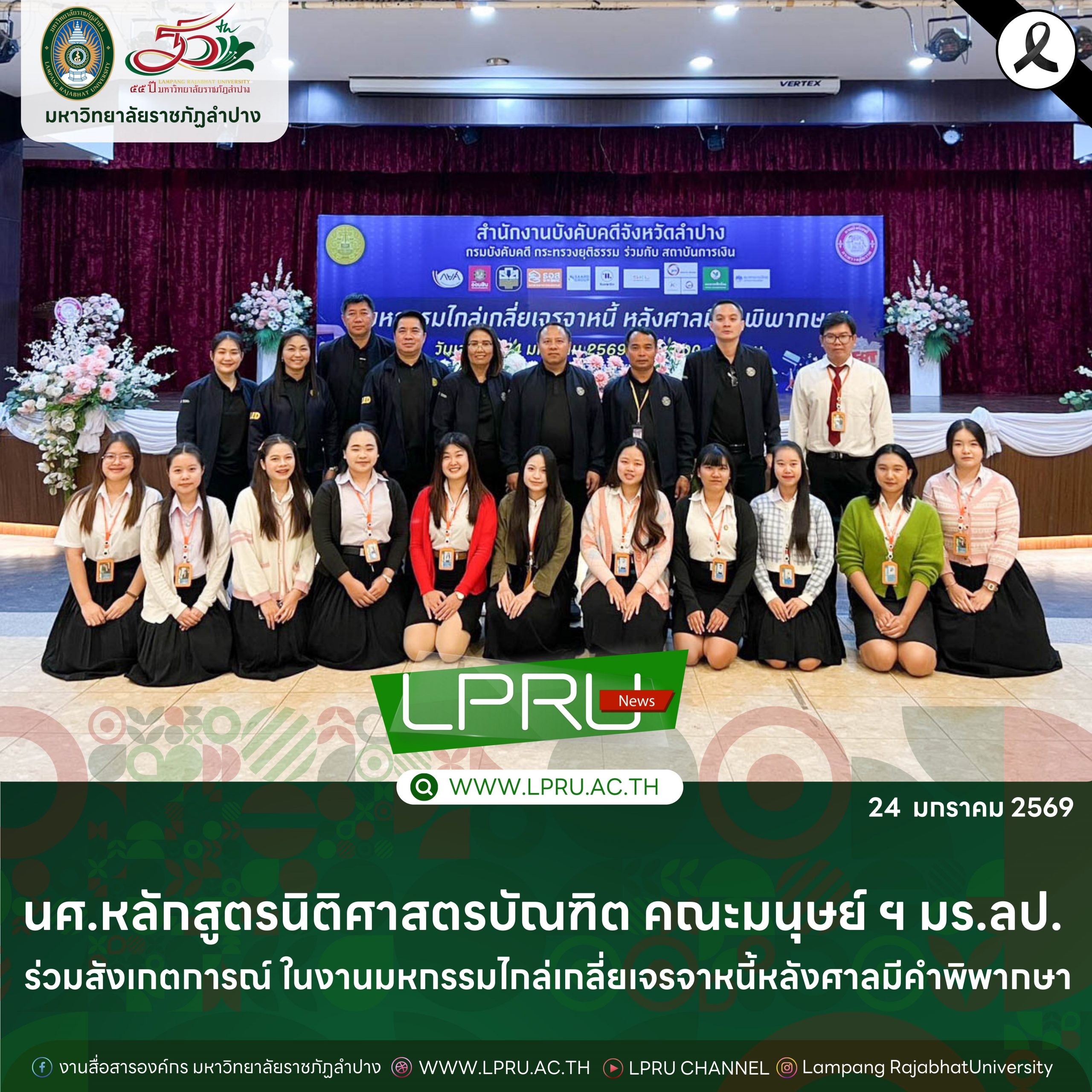 ผศ.อัคจร บุปผาจำเริญ รองคณบดีคณะมนุษยศาสตร์และสังคมศาสตร์ มหาวิทยาลัยราชภัฏลำปาง เปิดเผยว่า เมื่อวันที่ 24 มกราคม 2569 นักศึกษาหลักสูตรนิติศาสตรบัณฑิต ชั้นปีที่ 3 และปีที่ 4 คณะมนุษยศาสตร์และสังคมศาสตร์ เข้าร่วมสังเกตการณ์ในงานมหกรรมไกล่เกลี่ยเจรจาหนี้หลังศาลมีคำพิพากษา ณ หอประชุมจันทน์ มหาวิทยาลัยราชภัฏลำปาง