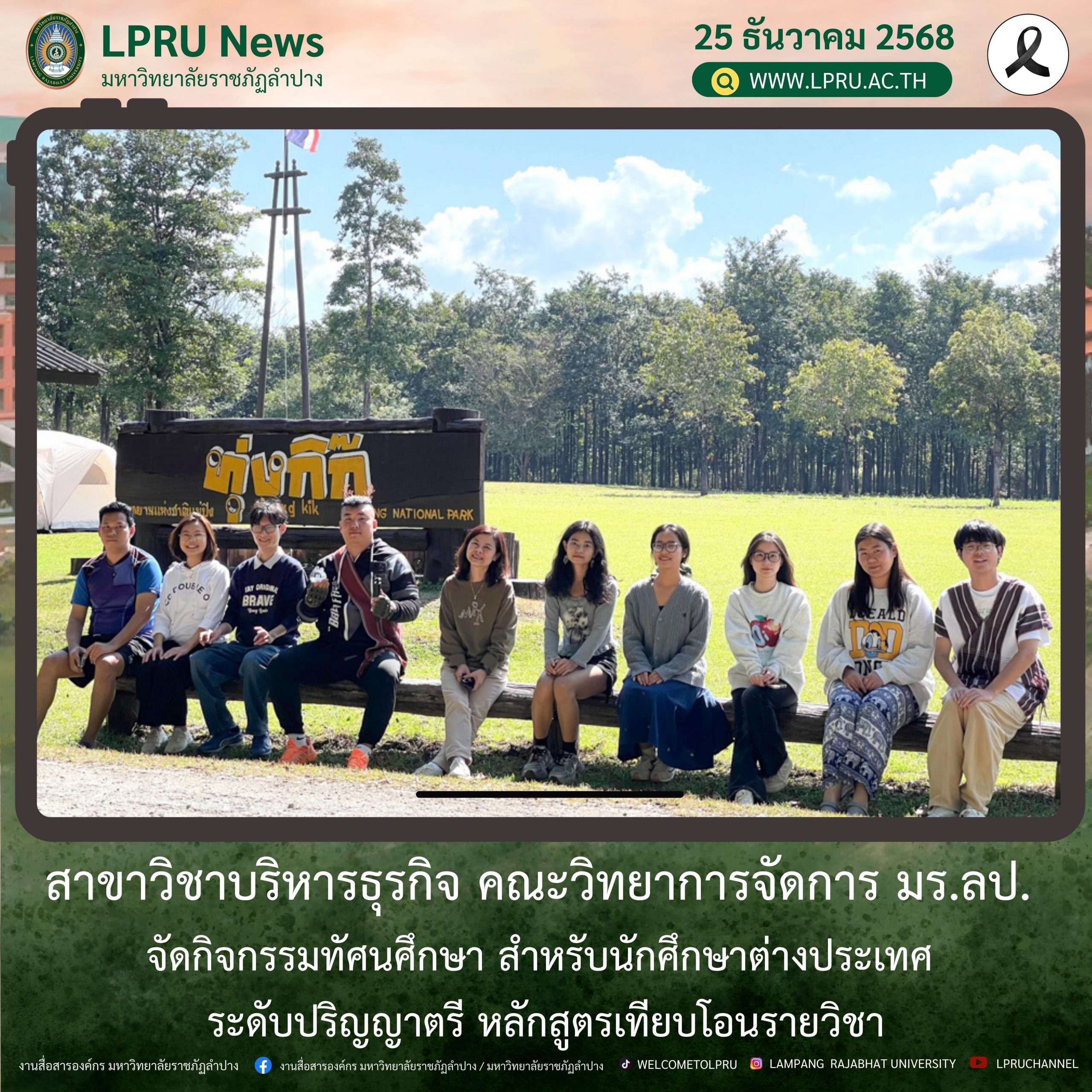 อ.ดร.นุสรา แสงอร่าม คณบดีคณะวิทยาการจัดการ พร้อมด้วย ผศ.ดร.วีรพร สุพจน์ธรรมจารี รองคณบดีคณะวิทยาการจัดการ อ.ชิดชนก วงศ์เครือ อาจารย์สังกัดสาขาวิชาบริหารธุรกิจ คณะวิทยาการจัดการ และนายธนวัฒน์ แต้คำ บุคลากรสังกัดงานบริหารทั่วไป คณะวิทยาการจัดการ จัดกิจกรรมทัศนศึกษา สำหรับนักศึกษาต่างประเทศ ระดับปริญญาตรี หลักสูตรเทียบโอนรายวิชา เมื่อวันที่ 19-21 ธันวาคม 2568 ณ อุทยานแห่งชาติแม่ปิง อำเภอลี้จังหวัดลำพูน
