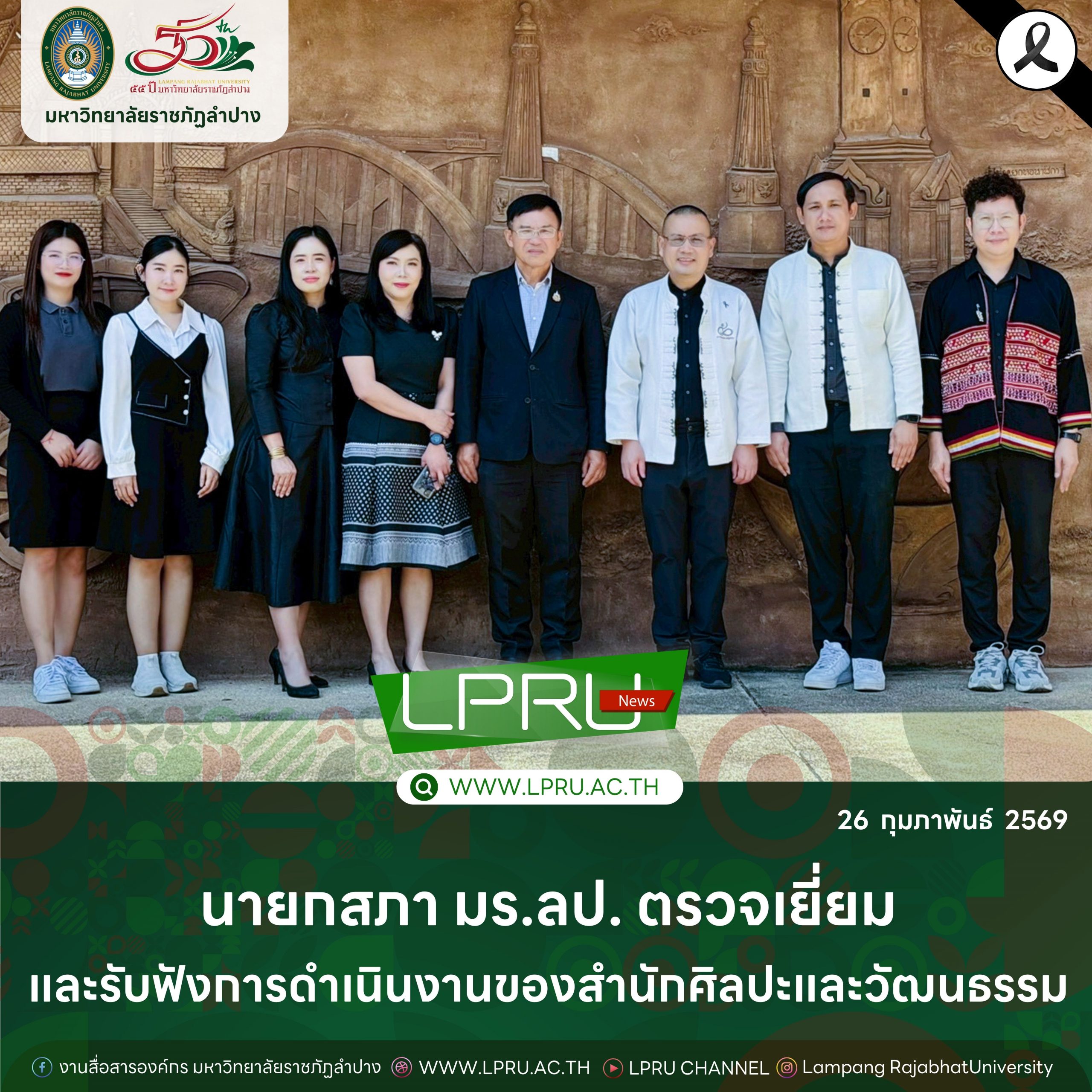 เมื่อวันที่ 26 กุมภาพันธ์ 2569 ศ.ดร.วิทยา จันทร์ศิลา นายกสภามหาวิทยาลัยราชภัฏลำปาง พร้อมด้วย รศ.ดร.ปริเยศ สิทธิสรวง รองอธิการบดีฝ่ายบริหาร ตรวจเยี่ยมและรับฟังการดำเนินงานของสำนักศิลปะและวัฒนธรรม ณ สำนักศิลปะและวัฒนธรรม มหาวิทยาลัยราชภัฏลำปาง โดยมี ผศ.เจษฎา ทองสุข ผู้อำนวยการสำนักศิลปะและวัฒนธรรม พร้อมด้วย อ.สุทธิมั่น ปิยะโกศล อ.ดร.เยาวลักษณ์ งามแสนโรจน์ รองผู้อำนวยการสำนักศิลปะและวัฒนธรรม น.ส.ธิดารัตน์ ไชยยาสืบ เจ้าหน้าที่บริหารงานทั่วไป ชำนาญการ ปฏิบัติหน้าที่ในตำแหน่งหัวหน้างานบริหารทั่วไป สำนักงานผู้อำนวยการสำนักศิลปะและวัฒนธรรม และบุคลากร ให้การต้อนรับและนำเสนอผลการดำเนินงานของสำนักศิลปะและวัฒนธรรม ระหว่างปีงบประมาณ พ.ศ. 2568 ถึงปัจจุบัน