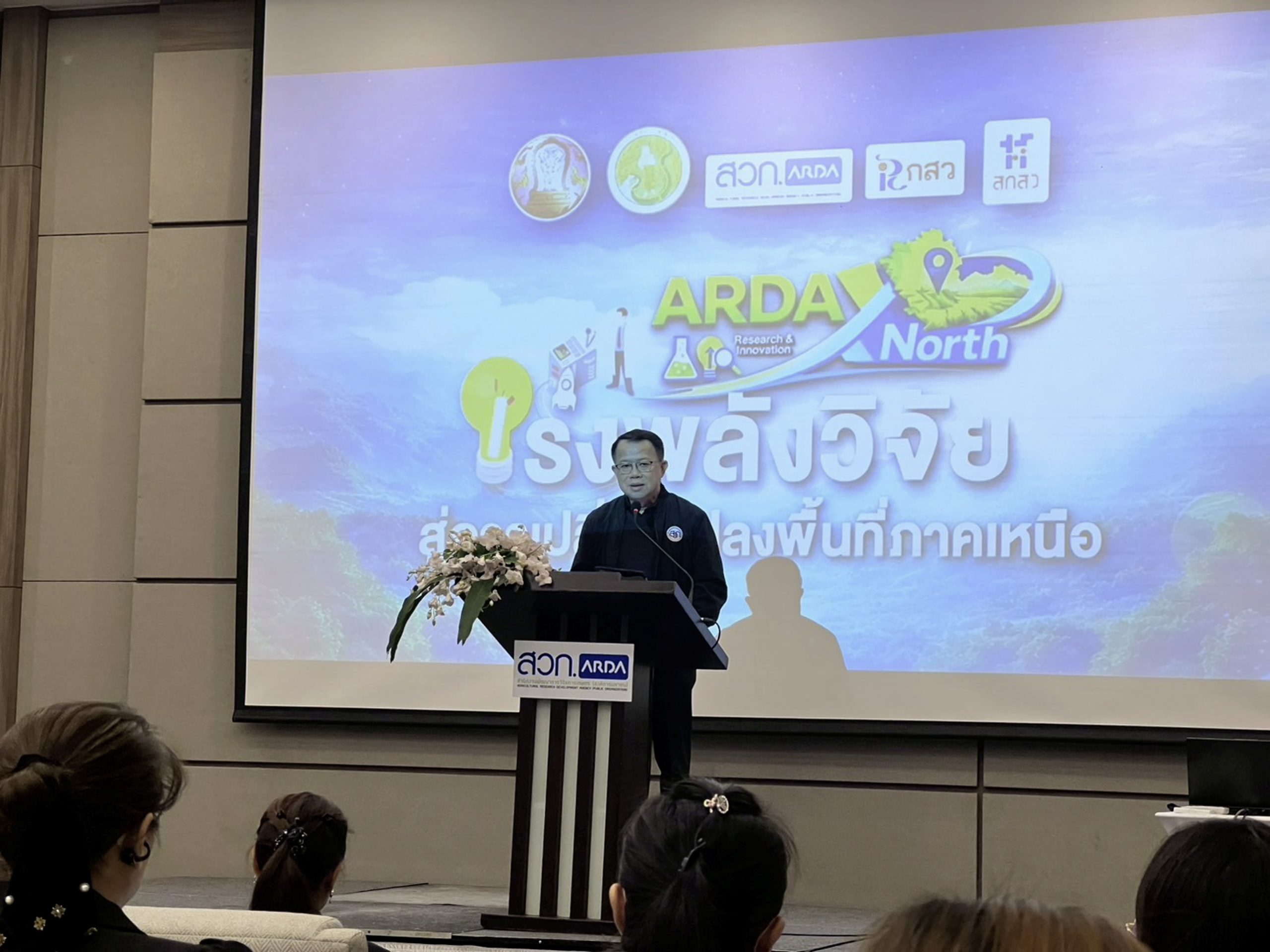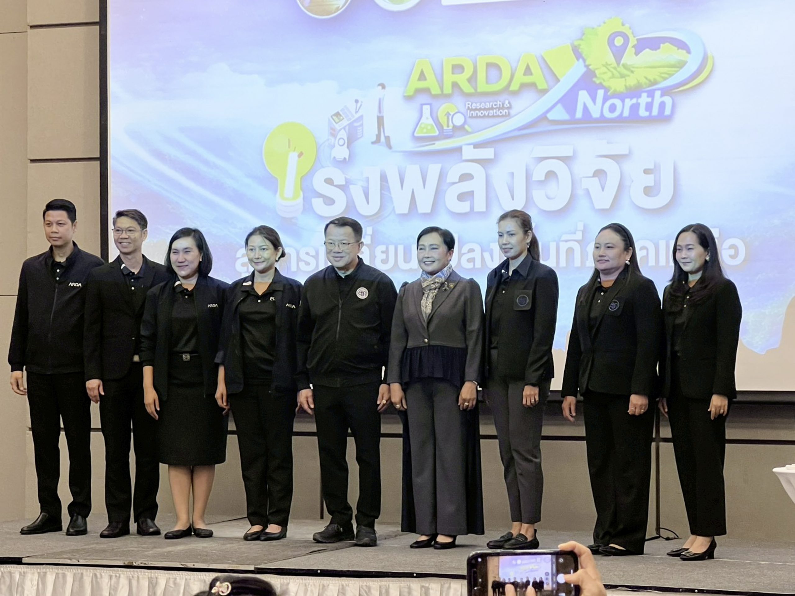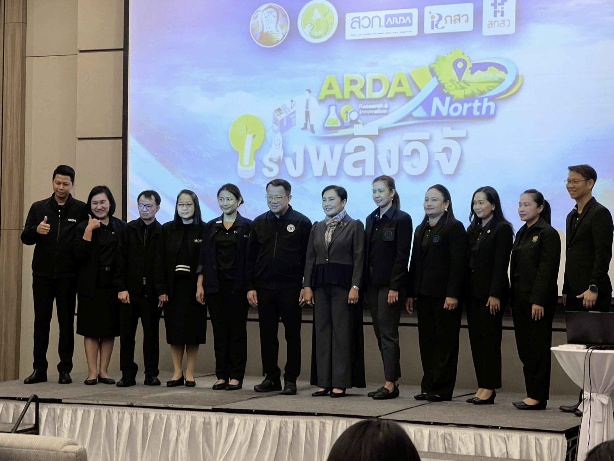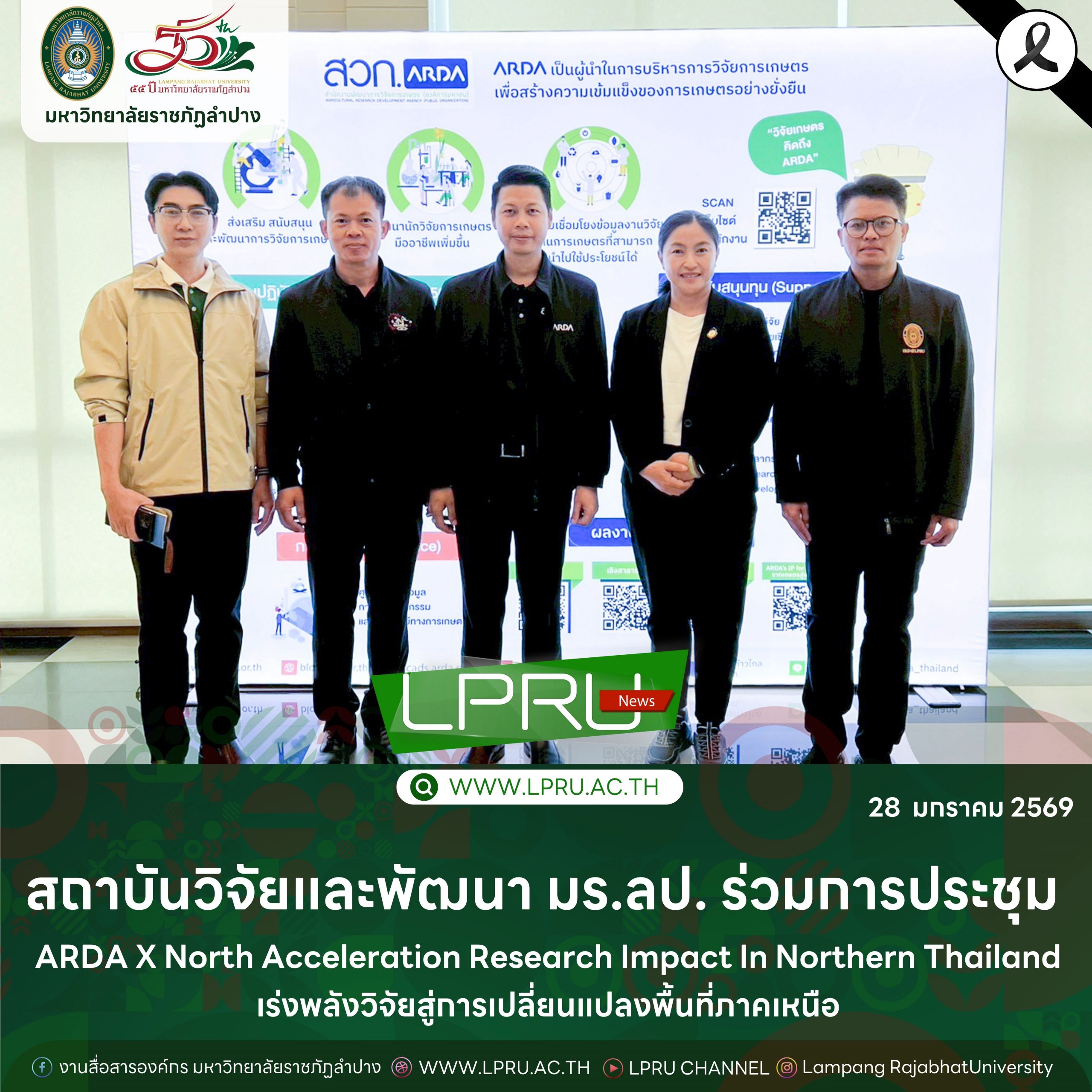 รศ.ธิติมา คุณยศยิ่ง ผู้อำนวยการสถาบันวิจัยและพัฒนา พร้อมด้วย ผศ.ดร.ณรงค์ คชภักดี รองผู้อำนวยการสถาบันวิจัยและพัฒนา ผศ.ว่าที่ ร.ต.ปฐมพงศ์ พรมมาบุญ อาจารย์สังกัดสาขาวิชาวิศวกรรมการบำรุงรักษา คณะเทคโนโลยีอุตสาหกรรม อ.เชาว์วุฒิ สิงห์แก้ว อาจารย์สังกัดสาขาวิชาวิทยาศาสตร์และเทคโนโลยีสิ่งแวดล้อม คณะวิทยาศาสตร์ และ น.ส.วิชญ์วรา เก๋ปัญญา เจ้าหน้าที่โครงการวิจัย สถาบันวิจัยและพัฒนา มหาวิทยาลัยราชภัฏลำปาง ร่วมการประชุม ARDA X North Acceleration Research Impact In Northern Thailand เร่งพลังวิจัยสู่การเปลี่ยนแปลงพื้นที่ภาคเหนือ เมื่อวันที่ 28 มกราคม 2569 ณ โรงแรมแคนทารีฮิลล์ อำเภอเมือง จังหวัดเชียงใหม่ โดยได้รับเกียรติจาก ศ.ดร.สมปอง คล้ายหนองสรวง ผู้อำนวยการสำนักงานคณะกรรมการส่งเสริม วิทยาศาสตร์ วิจัยและนวัตกรรม ดร.ทวีศักดิ์ ธนเดโชพล ผู้อำนวยการสำนักงานพัฒนาการวิจัยการเกษตร กล่าวรายงานวัตถุประสงค์และภาพรวมของการจัดงาน