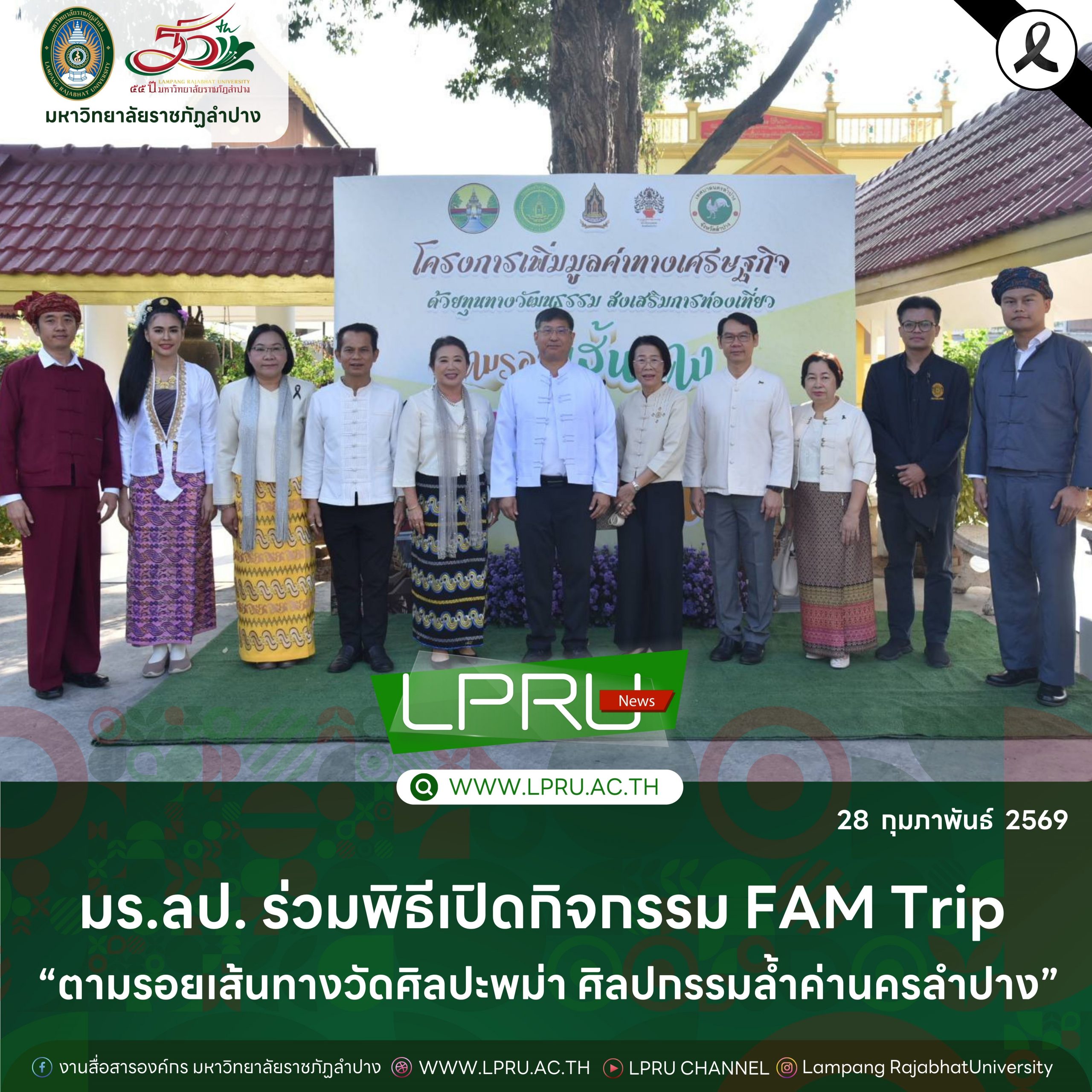 เมื่อวันที่ 28 กุมภาพันธ์ 2569 ผศ.ดร.ณรงค์ คชภักดี รองผู้อำนวยการสถาบันวิจัยและพัฒนา พร้อมด้วย อ.ธวัชชัย ทำทอง อาจารย์สังกัดสาขาวิชานวัตกรรมการท่องเที่ยวและธุรกิจบริการ คณะวิทยาการจัดการ มหาวิทยาลัยราชภัฏลำปาง ร่วมพิธีเปิดกิจกรรม FAM Trip “ตามรอยเส้นทางวัดศิลปะพม่า ศิลปกรรมล้ำค่านครลำปาง” ณ วัดท่ามะโอ อำเภอเมืองลำปาง จังหวัดลำปาง โดยมี นายพัชระ สิมะเสถียร รองผู้ว่าราชการจังหวัดลำปาง เป็นประธานพิธีเปิด พร้อมด้วย นายเจษฎา ชีวะวิชวาลกุล ผู้ตรวจราชการกระทรวงวัฒนธรรม นางเบ็ญจมาส บุญเทพ วัฒนธรรมจังหวัดลำปาง วัฒนธรรมจังหวัดพื้นที่ภาคเหนือ หัวหน้าส่วนราชการ และสื่อมวลชน ร่วมพิธีเปิด