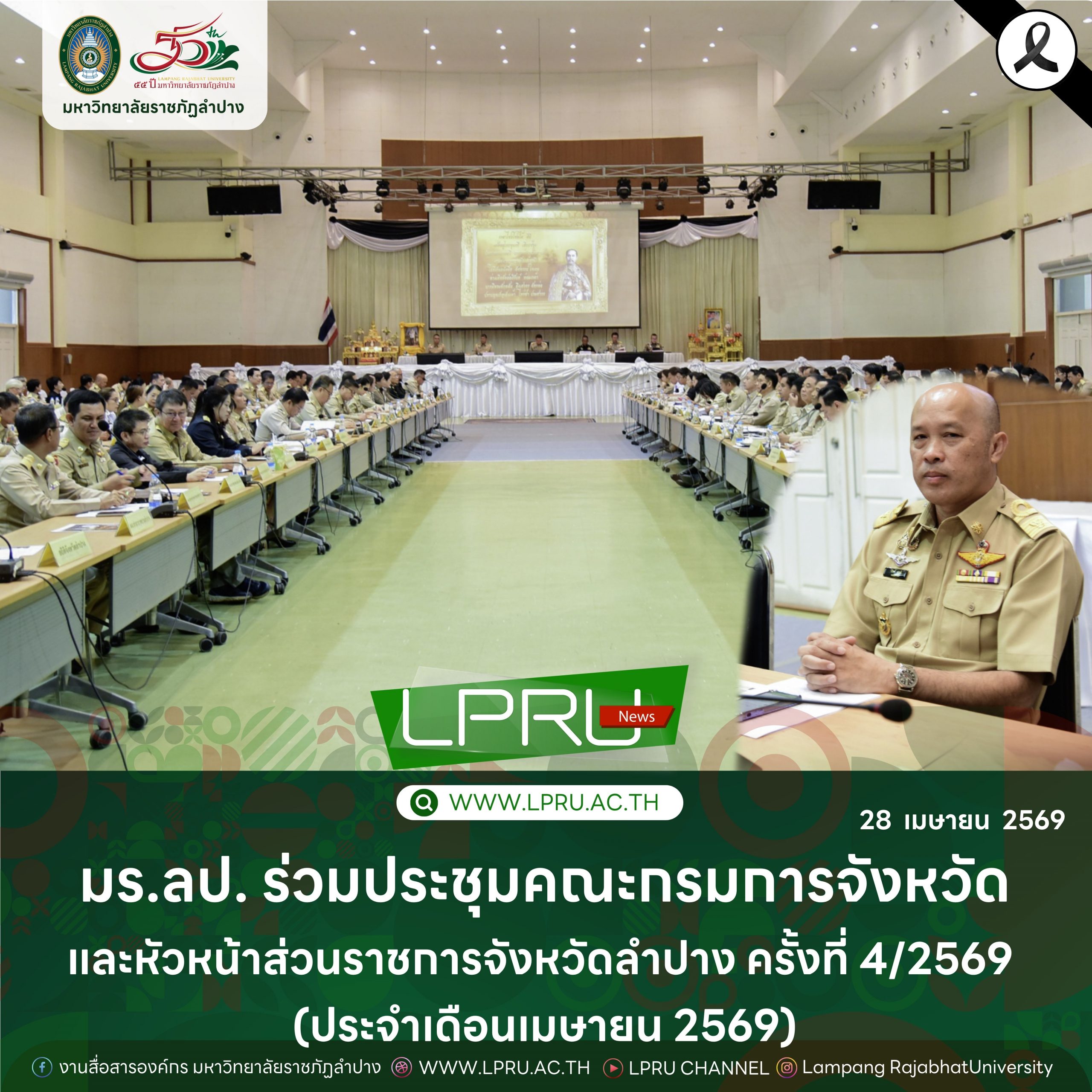 เมื่อวันที่ 28 เมษายน 2569 รศ.ปริตต์ สายสี รองอธิการบดีฝ่ายกิจการนักศึกษา มหาวิทยาลัยราชภัฏลำปาง ร่วมประชุมคณะกรมการจังหวัดและหัวหน้าส่วนราชการจังหวัดลำปาง ครั้งที่ 4/2569 (ประจำเดือนเมษายน 2569) ณ หอประชุมจังหวัดลำปาง โดยมี นายวิวัฒน์ อินทร์ไทยวงศ์ ผู้ว่าราชการจังหวัดลำปาง เป็นประธานการประชุม