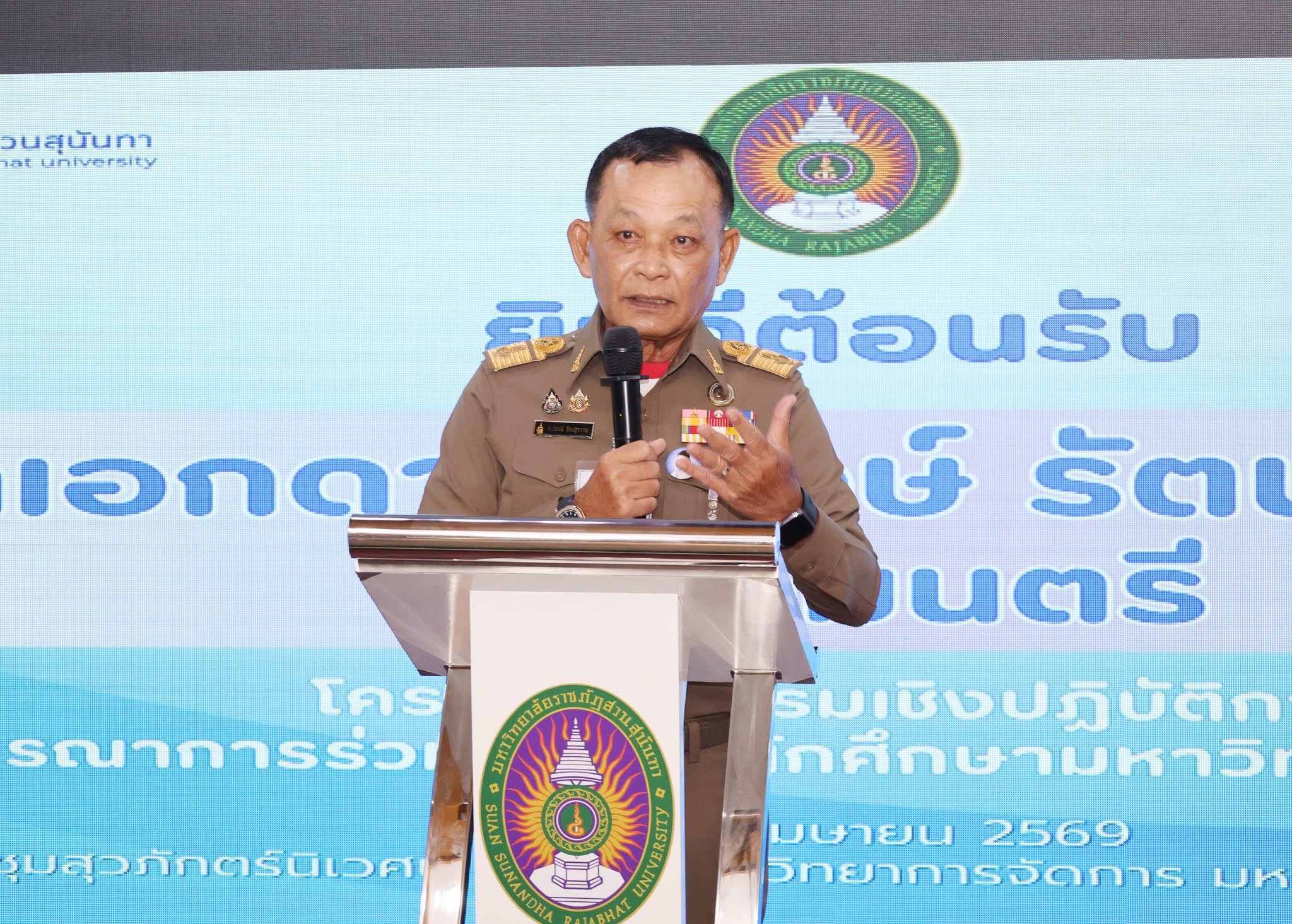 พร้อมกันนี้ พลเอก ดาว์พงษ์ รัตนสุวรรณ องคมนตรี ได้ตรวจเยี่ยมและให้กำลังใจผู้เข้าร่วมอบรม เมื่อวันที่ 28 เมษายน 2569 โดยการอบรมในครั้งนี้จัดขึ้นเพื่อให้บุคลากรที่รับผิดชอบเกี่ยวกับการจัดกิจกรรม ส่งเสริมการพัฒนานักศึกษาของมหาวิทยาลัยราชภัฏ 38 แห่ง ให้สามารถยกระดับศักยภาพนักศึกษาของมหาวิทยาลัยราชภัฏ มุ่งเน้นการสร้างคุณลักษณะบัณฑิตที่พึงประสงค์ผ่านการบูรณาการกิจกรรม เสริมหลักสูตรเข้ากับการเรียนการสอน รวมถึงการจัดทำกระบวนการจัดการความรู้ เพื่อให้เกิดการสร้างองค์ความรู้ที่เข้าถึงได้ง่าย สามารถนำไปใช้ปฏิบัติงาน พัฒนาไปสู่งองค์กรแห่งการเรียนรู้ได้อย่างมีประสิทธิภาพสูงสุด โดยได้รับเกียรติจาก ดร.นงรัตน์ อิสโร ที่ปรึกษาที่ประชุมอธิการบดีมหาวิทยาลัยราชภัฏ และประธานมูลนิธิไทยยั่งยืน เป็นวิทยากรการอบรม การจัดทำ (ร่าง) แผนงานบูรณาการร่วมพัฒนานักศึกษามหาวิทยาลัยราชภัฏทั่วประเทศ ระยะ 5 ปี การกำหนดรูปแบบ แนวทางการดำเนินงานตามโครงการยุทธศาสตร์ราชภัฏเพื่อการพัฒนาท้องถิ่นของมหาวิทยาลัยราชภัฏทั่วประเทศ และการจัดทำระบบการจัดการความรู้ด้านงานกิจการนักศึกษา (Knowledge Managenent) โดยมีคณะผู้บริการ คณาจารย์ และบุคลากรจากมหาวิทยาลัยราชภัฏทั่วประเทศเข้าร่วมกิจกรรมกว่า 100 คน