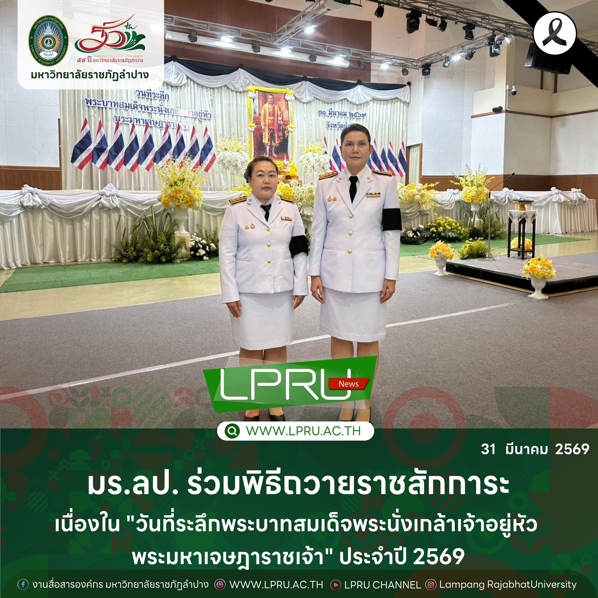 เมื่อวันที่ 31 มีนาคม 2569 ผศ.ปิยะรัตน์ ทองธานี พร้อมด้วย ผศ.ดร.รจเรจ นันตา รองคณบดีคณะเทคโนโลยีการเกษตร มหาวิทยาลัยราชภัฏลำปาง ร่วมพิธีถวายราชสักการะเนื่องใน “วันที่ระลึกพระบาทสมเด็จพระนั่งเกล้าเจ้าอยู่หัว พระมหาเจษฎาราชเจ้า” ประจำปี 2569 ณ อาคารหอประชุมจังหวัดลำปาง โดยมี นายวิวัฒน์ อินทร์ไทยวงศ์ ผู้ว่าราชการจังหวัดลำปาง เป็นประธานในพิธี