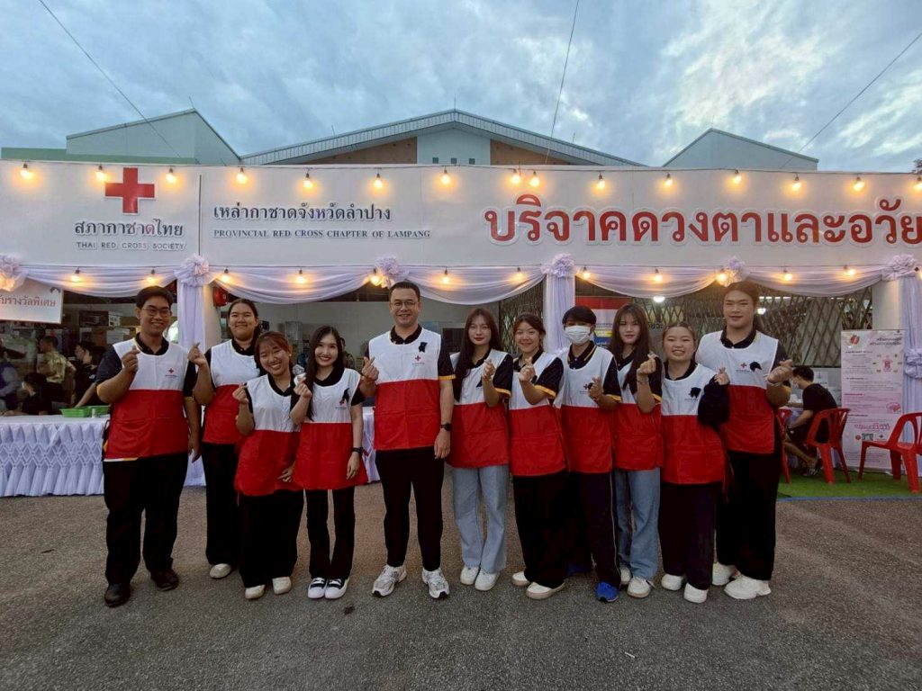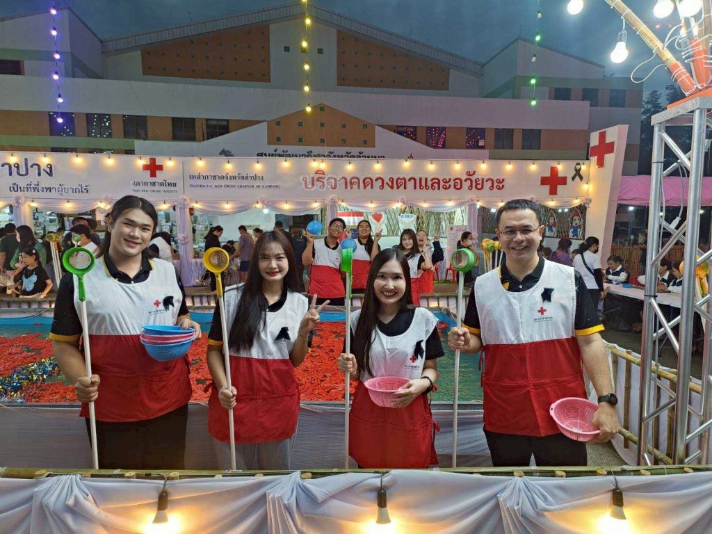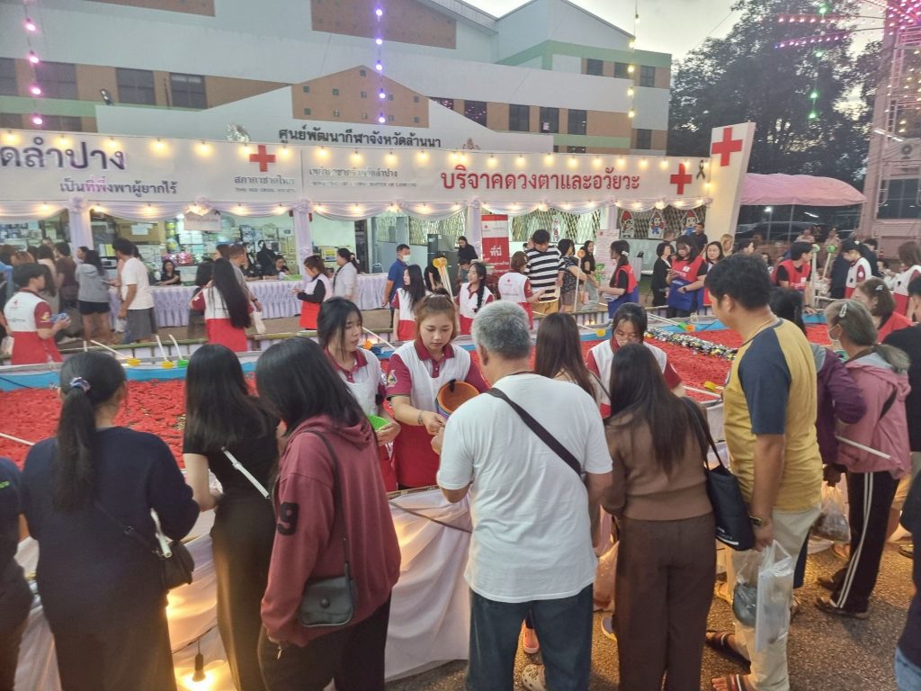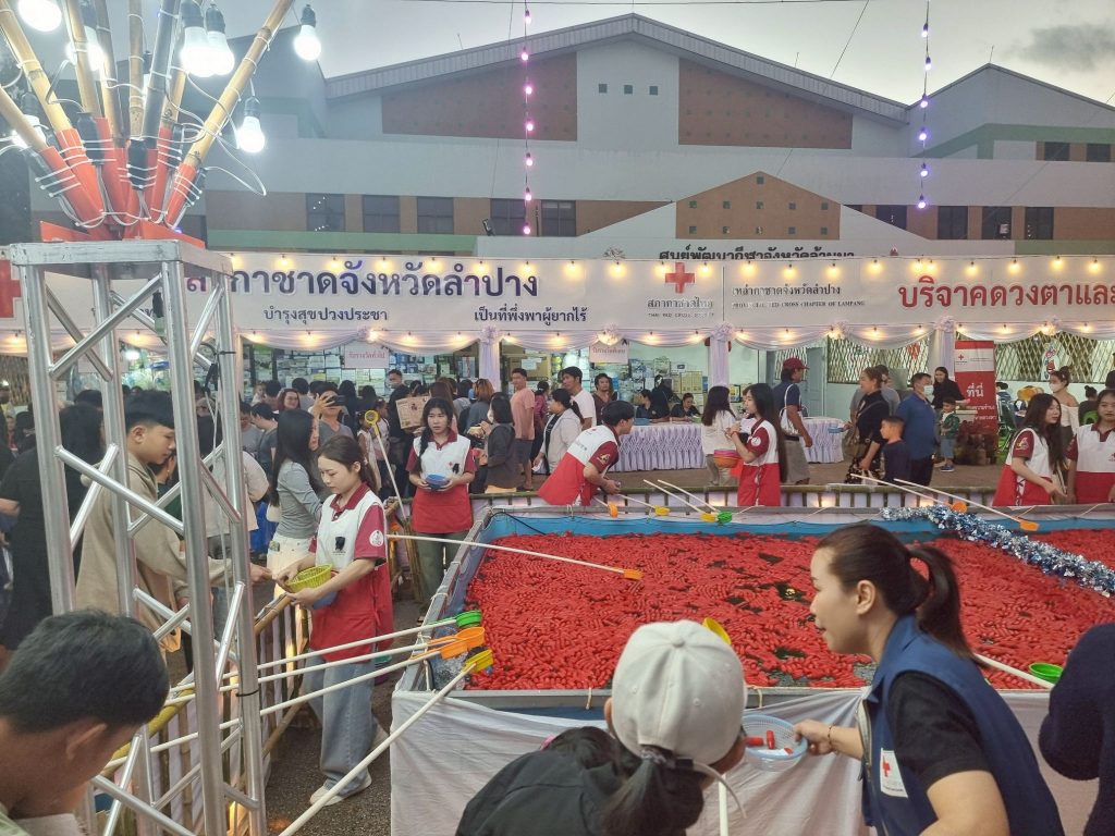 ต่อมาในวันที่ 14 ธันวาคม 2568 นายธีธนิน แสงสวัสดิ์ นักวิชาการศึกษา ปฏิบัติการ สังกัดงานวิชาการและกิจการนักศึกษา คณะวิทยาการจัดการ พร้อมด้วยนักศึกษาคณะวิทยาการจัดการ มหาวิทยาลัยราชภัฏลำปาง จำนวน 14 คน เข้าร่วมกิจกรรมจิตอาสาประจำจุดร้านมัจฉากาชาดในงานเดียวกัน เพื่อร่วมสืบสานภารกิจการกุศลและสร้างประโยชน์ต่อสังคม
