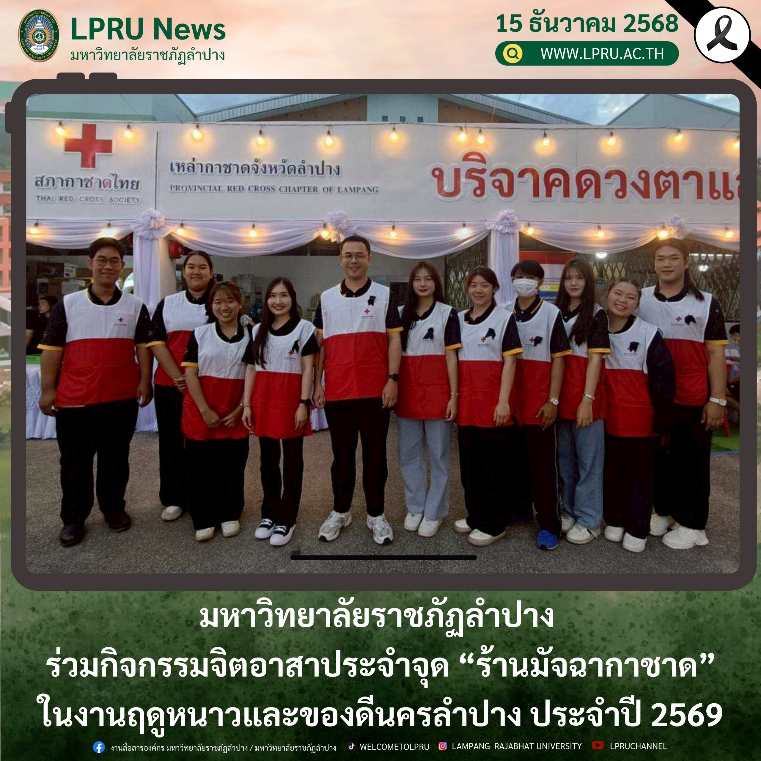 มหาวิทยาลัยราชภัฏลำปาง ร่วมกิจกรรมจิตอาสาประจำจุด ร้านมัจฉากาชาด ในงานฤดูหนาวและของดีนครลำปาง ประจำปี 2569 เมื่อวันที่ 13–14 ธันวาคม 2568 ณ สนามกีฬากลางจังหวัดลำปาง ตำบลบ่อแฮ้ว อำเภอเมืองลำปาง จังหวัดลำปาง เพื่อสนับสนุนการดำเนินงานของเหล่ากาชาดจังหวัดลำปาง และส่งเสริมจิตสาธารณะของคณาจารย์และนักศึกษา โดยมี อ.ภัทรนัย ไชยพรม รองคณบดีฝ่ายกิจการนักศึกษา คณะวิทยาศาสตร์ และ ผศ.ชัชชฎาภรณ์ พิศมร ประธานสาขาวิชาสาธารณสุขชุมชน คณะวิทยาศาสตร์ พร้อมด้วยนักศึกษาคณะวิทยาศาสตร์มหาวิทยาลัยราชภัฏลำปาง จำนวน 8 คน เข้าร่วมปฏิบัติงานจิตอาสาประจำจุดร้านมัจฉากาชาด ดูแลการให้บริการประชาชนและอำนวยความสะดวกภายในพื้นที่กิจกรรม