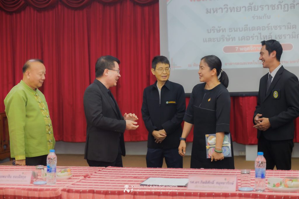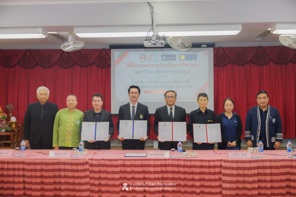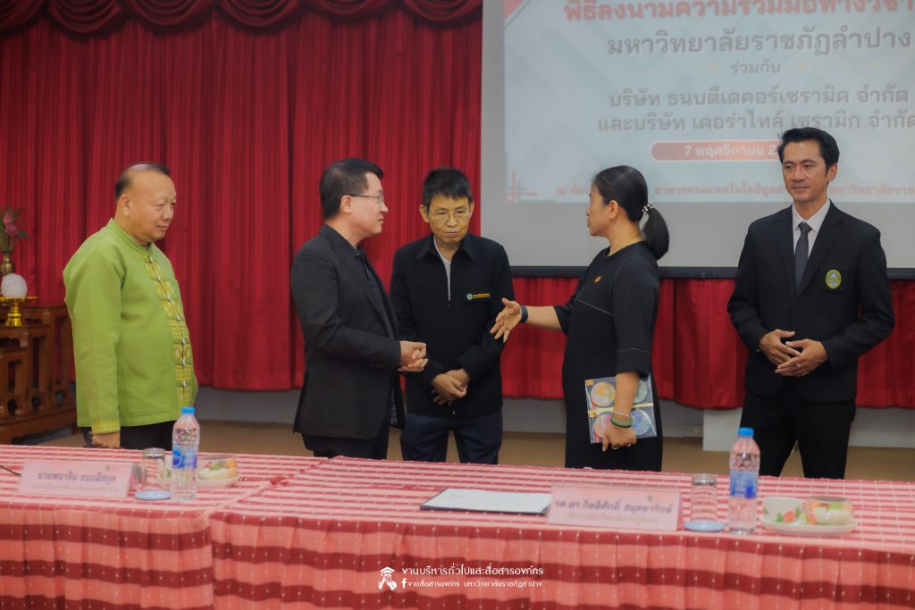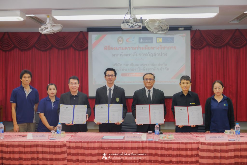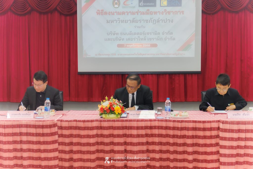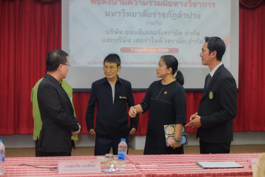 เมื่อวันที่ 7 พฤศจิกายน 2568 มหาวิทยาลัยราชภัฏลำปาง โดย รศ.ดร.กิตติศักดิ์ สมุทธารักษ์ อธิการบดีมหาวิทยาลัยราชภัฏลำปาง จัดพิธีลงนามบันทึกข้อตกลงความร่วมมือทางวิชาการ (MOU) กับ บริษัท เคอร่าไทล์ เซรามิก จำกัด โดยนายปรีชา ศรีมาลา ผู้จัดการโรงงานฝ่ายลำปาง และ บริษัท ธนบดีเดคอร์เซรามิค จำกัด โดย นายพนาสิน ธนบดีสกุล เพื่อร่วมพัฒนาการเรียนการสอน การฝึกประสบการณ์วิชาชีพ และการจัดการศึกษาตามระบบสหกิจศึกษาที่บูรณาการกับการทำงาน (CWIE) สำหรับนักศึกษาคณะเทคโนโลยีอุตสาหกรรม สาขาวิชาเทคโนโลยีเซรามิกส์สร้างสรรค์ ณ ห้องประชุม 1315 คณะเทคโนโลยีอุตสาหกรรม มหาวิทยาลัยราชภัฏลำปาง โดยมี ผศ.สุวรรณี จันทร์ตา รองอธิการบดีฝ่ายวิชาการ ผศ.จักรกฤษณ์ ฮั่นยะลา คณบดีคณะเทคโนโลยีอุตสาหกรรม ร่วมลงนามเป็นพยาน นอกจากนี้ได้รับเกียรติจาก นายพีระรักษ์ พิชญกุล ประธานหอการค้าจังหวัดลำปาง นายกิติศักดิ์ สินวนาทรัพย์ นายกกิตติมศักดิ์สมาคมเครื่องปั้นดินเผาลำปาง นายจักรพงษ์ กลิ่นวงษ์ รองประธานสภาอุตสาหกรรมจังหวัดลำปาง และผู้บริหาร คณาจารย์ คณะเทคโนโลยีอุตสาหกรรม ร่วมเป็นสักขีพยาน