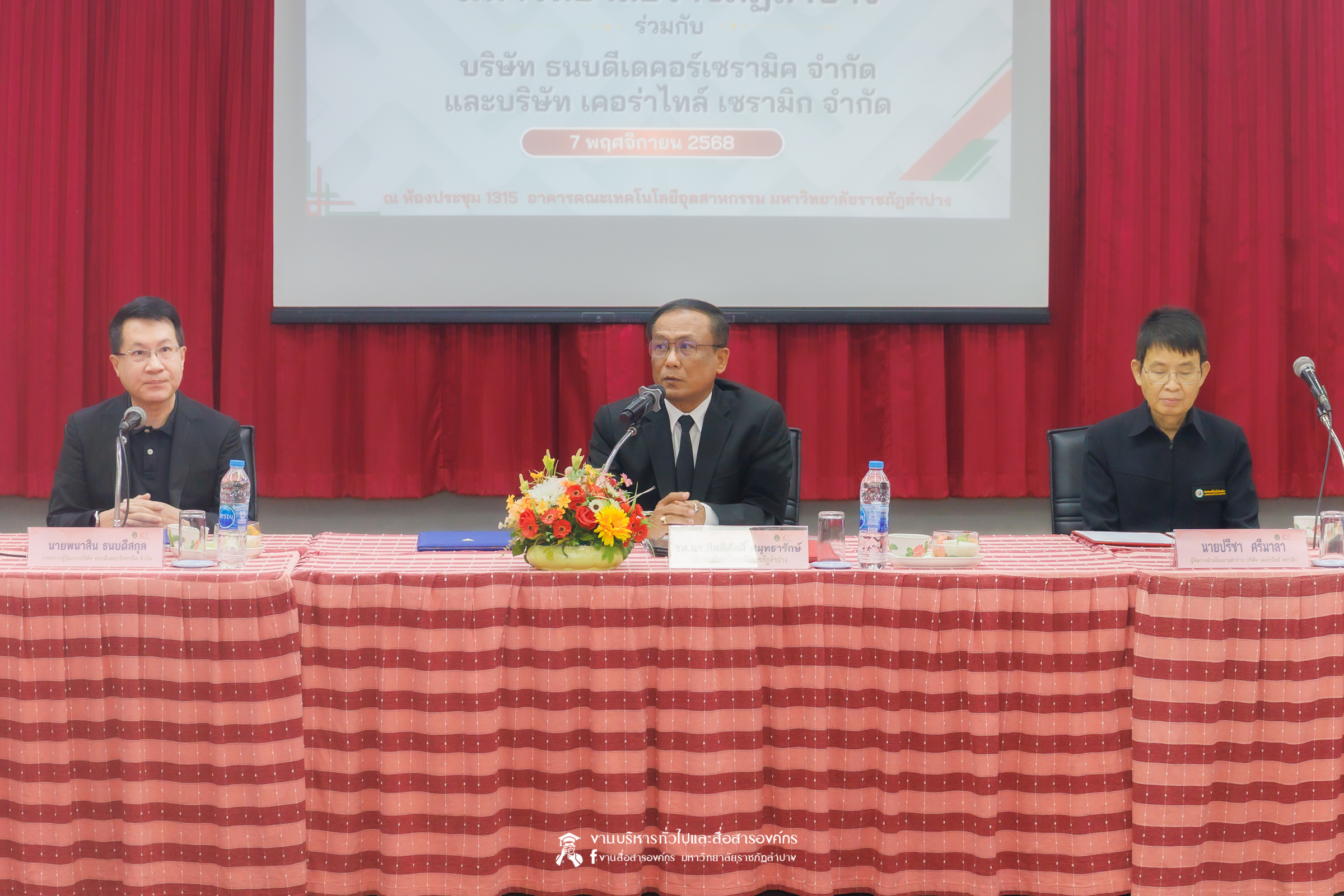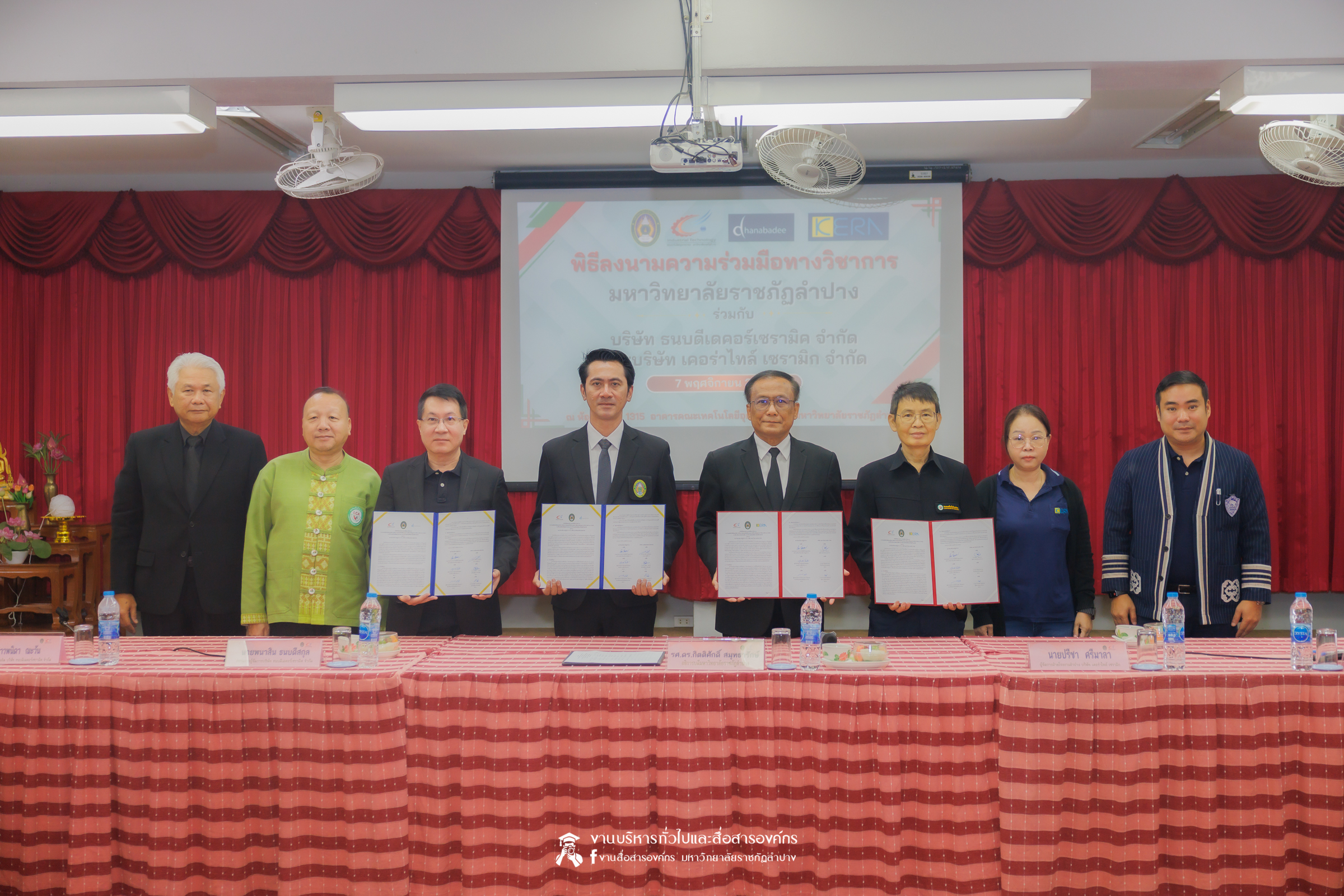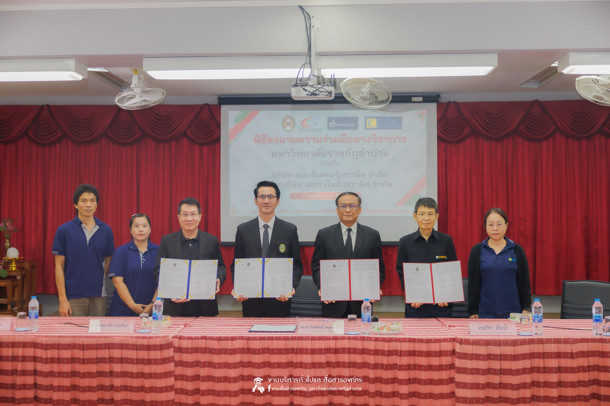 เมื่อวันที่ 7 พฤศจิกายน 2568 มหาวิทยาลัยราชภัฏลำปาง โดย รศ.ดร.กิตติศักดิ์ สมุทธารักษ์ อธิการบดีมหาวิทยาลัยราชภัฏลำปาง จัดพิธีลงนามบันทึกข้อตกลงความร่วมมือทางวิชาการ (MOU) กับ บริษัท เคอร่าไทล์ เซรามิก จำกัด โดยนายปรีชา ศรีมาลา ผู้จัดการโรงงานฝ่ายลำปาง และ บริษัท ธนบดีเดคอร์เซรามิค จำกัด โดย นายพนาสิน ธนบดีสกุล เพื่อร่วมพัฒนาการเรียนการสอน การฝึกประสบการณ์วิชาชีพ และการจัดการศึกษาตามระบบสหกิจศึกษาที่บูรณาการกับการทำงาน (CWIE) สำหรับนักศึกษาคณะเทคโนโลยีอุตสาหกรรม สาขาวิชาเทคโนโลยีเซรามิกส์สร้างสรรค์ ณ ห้องประชุม 1315 คณะเทคโนโลยีอุตสาหกรรม มหาวิทยาลัยราชภัฏลำปาง โดยมี ผศ.สุวรรณี จันทร์ตา รองอธิการบดีฝ่ายวิชาการ ผศ.จักรกฤษณ์ ฮั่นยะลา คณบดีคณะเทคโนโลยีอุตสาหกรรม ร่วมลงนามเป็นพยาน นอกจากนี้ได้รับเกียรติจาก นายพีระรักษ์ พิชญกุล ประธานหอการค้าจังหวัดลำปาง นายกิติศักดิ์ สินวนาทรัพย์ นายกกิตติมศักดิ์สมาคมเครื่องปั้นดินเผาลำปาง นายจักรพงษ์ กลิ่นวงษ์ รองประธานสภาอุตสาหกรรมจังหวัดลำปาง และผู้บริหาร คณาจารย์ คณะเทคโนโลยีอุตสาหกรรม ร่วมเป็นสักขีพยาน