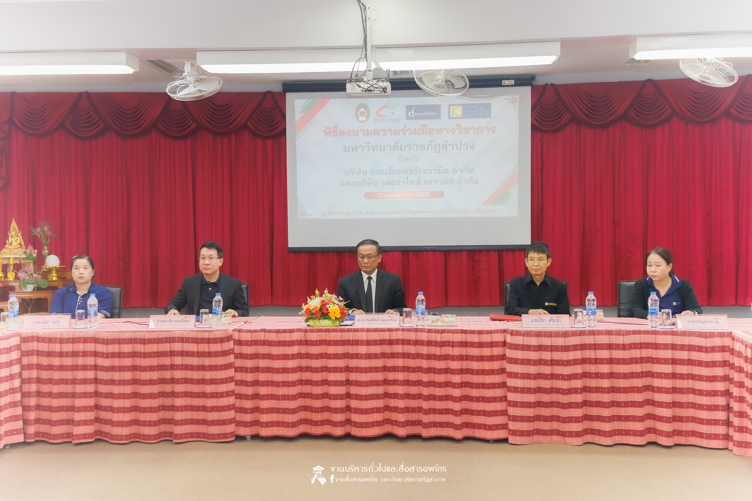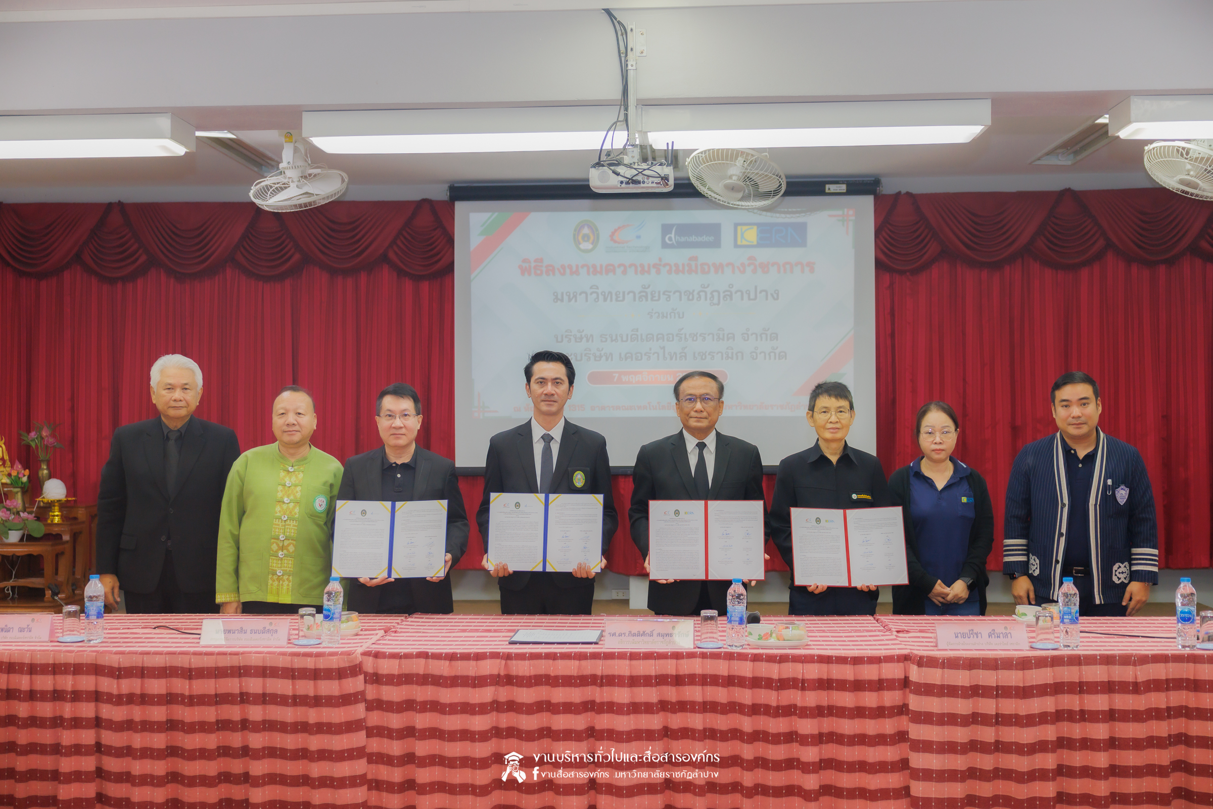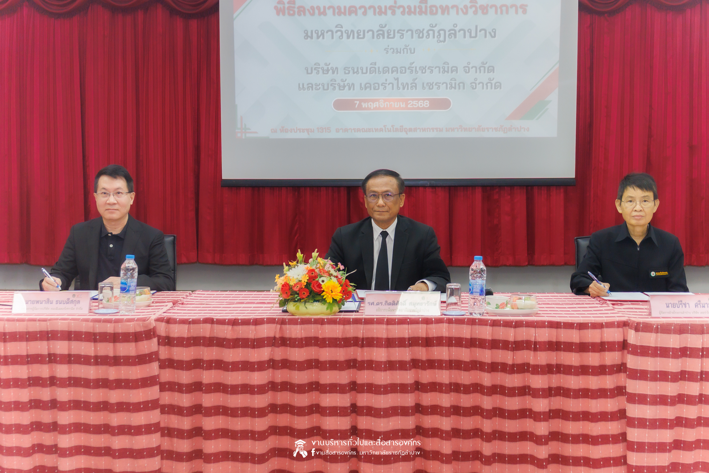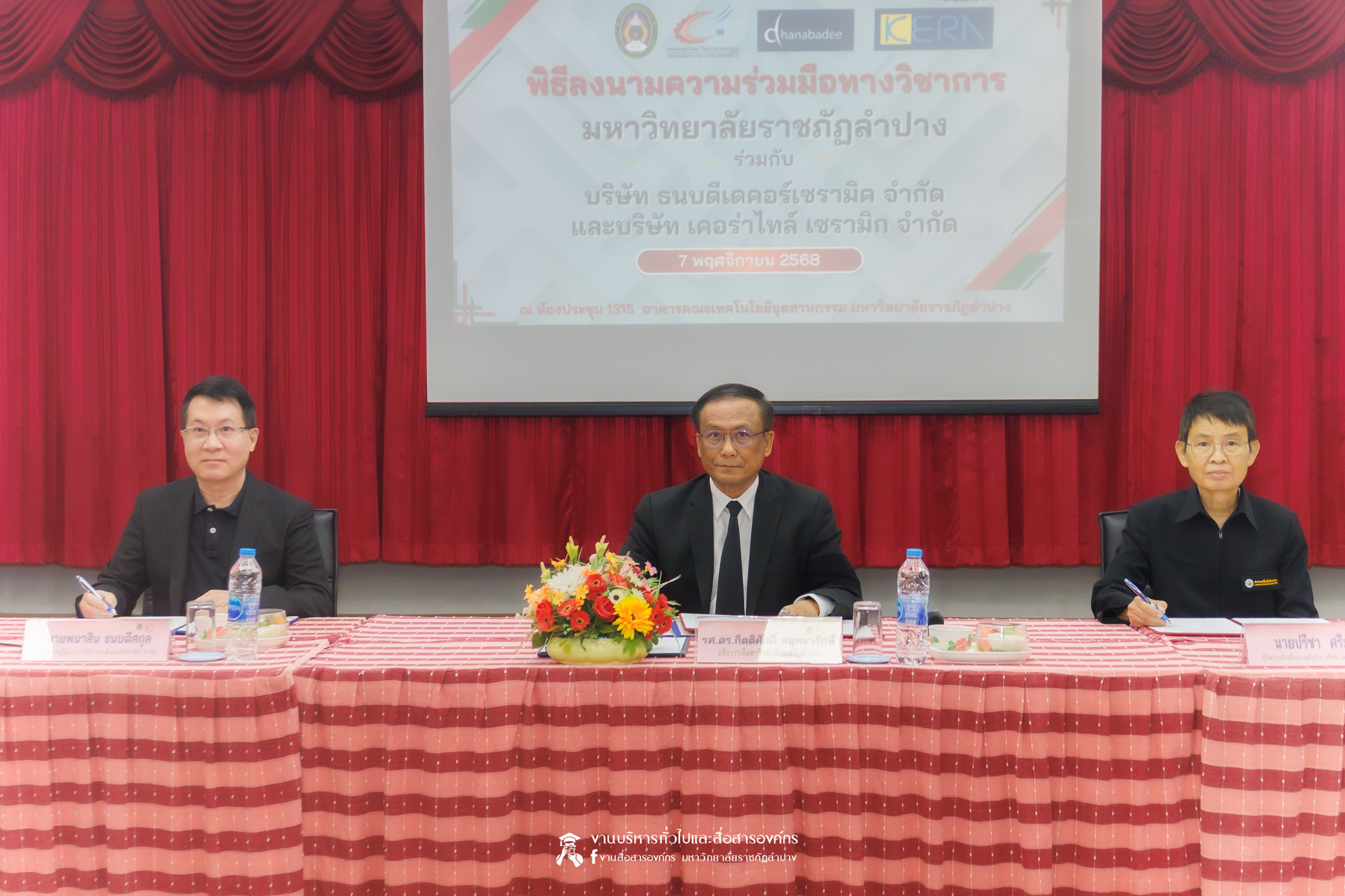 เมื่อวันที่ 7 พฤศจิกายน 2568 มหาวิทยาลัยราชภัฏลำปาง โดย รศ.ดร.กิตติศักดิ์ สมุทธารักษ์ อธิการบดีมหาวิทยาลัยราชภัฏลำปาง จัดพิธีลงนามบันทึกข้อตกลงความร่วมมือทางวิชาการ (MOU) กับ บริษัท เคอร่าไทล์ เซรามิก จำกัด โดยนายปรีชา ศรีมาลา ผู้จัดการโรงงานฝ่ายลำปาง และ บริษัท ธนบดีเดคอร์เซรามิค จำกัด โดย นายพนาสิน ธนบดีสกุล เพื่อร่วมพัฒนาการเรียนการสอน การฝึกประสบการณ์วิชาชีพ และการจัดการศึกษาตามระบบสหกิจศึกษาที่บูรณาการกับการทำงาน (CWIE) สำหรับนักศึกษาคณะเทคโนโลยีอุตสาหกรรม สาขาวิชาเทคโนโลยีเซรามิกส์สร้างสรรค์ ณ ห้องประชุม 1315 คณะเทคโนโลยีอุตสาหกรรม มหาวิทยาลัยราชภัฏลำปาง โดยมี ผศ.สุวรรณี จันทร์ตา รองอธิการบดีฝ่ายวิชาการ ผศ.จักรกฤษณ์ ฮั่นยะลา คณบดีคณะเทคโนโลยีอุตสาหกรรม ร่วมลงนามเป็นพยาน นอกจากนี้ได้รับเกียรติจาก นายพีระรักษ์ พิชญกุล ประธานหอการค้าจังหวัดลำปาง นายกิติศักดิ์ สินวนาทรัพย์ นายกกิตติมศักดิ์สมาคมเครื่องปั้นดินเผาลำปาง นายจักรพงษ์ กลิ่นวงษ์ รองประธานสภาอุตสาหกรรมจังหวัดลำปาง และผู้บริหาร คณาจารย์ คณะเทคโนโลยีอุตสาหกรรม ร่วมเป็นสักขีพยาน