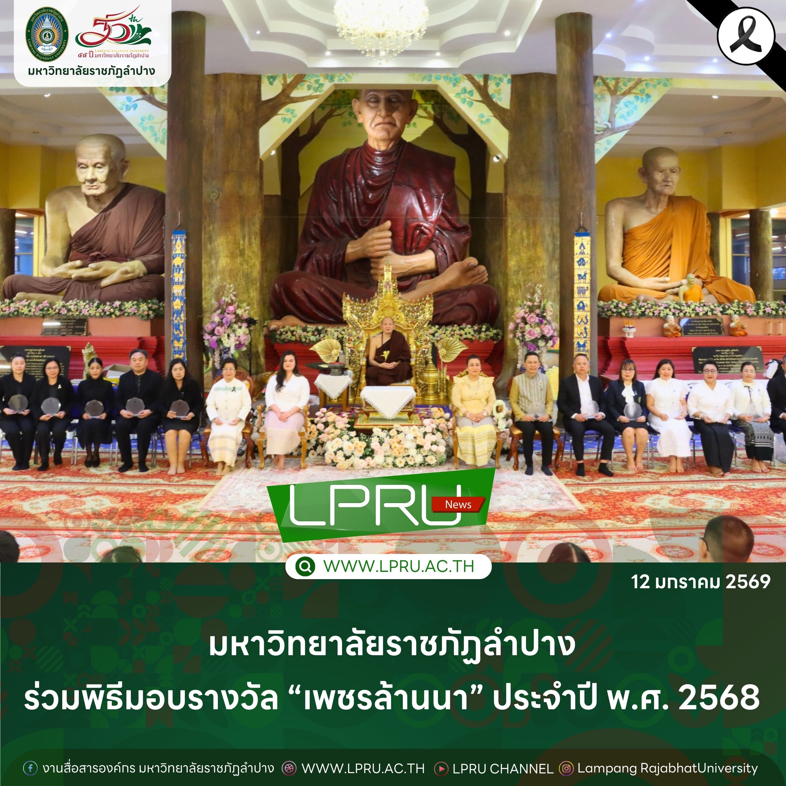เมื่อวันที่ 11 มกราคม 2569 อ.อัจฉริยา ครุธาโรจน์ ผู้ช่วยอธิการบดีด้านวิเทศสัมพันธ์ เป็นผู้แทนอธิการบดีมหาวิทยาลัยราชภัฏลำปาง ร่วมพิธีมอบรางวัล “เพชรล้านนา” ประจำปี พ.ศ. 2568 พร้อมเข้ารับโล่ประกาศเกียรติคุณ หน่วยงานสนับสนุนการจัดสอบ (ศูนย์สอบ จังหวัดลำปาง) จากพระภาวนารัตนญาณ วิ. (ครูบาอริยชาติ อริยจิตฺโต) ณ วัดแสงแก้วโพธิญาณ อำเภอแม่สรวย จังหวัดเชียงราย