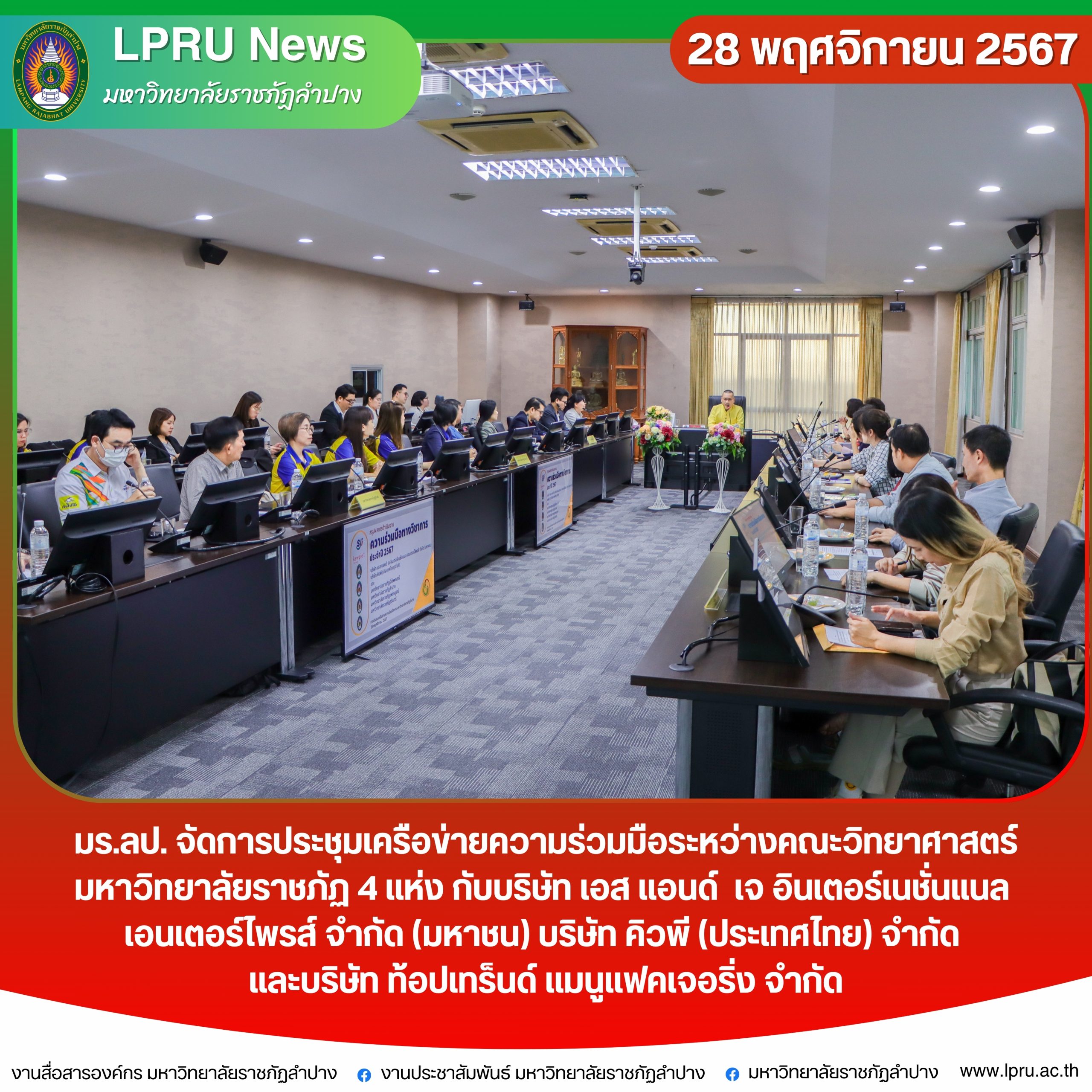 มร.ลป. จัดการประชุมเครือข่ายความร่วมมือระหว่างคณะวิทยาศาสตร์ มหาวิทยาลัยราชภัฏ 4 แห่ง กับบริษัท เอส แอนด์ เจ อินเตอร์เนชั่นแนล เอนเตอร์ไพรส์ จำกัด (มหาชน) บริษัท คิวพี (ประเทศไทย) จำกัด และบริษัท ท้อปเทร็นด์ เเมนูแฟคเจอริ่ง จำกัด Post navigation Previous: สาขาวิชาภาษาอังกฤษ ค.บ. มร.ลป. จัดกิจกรรมบริการวิชาการจัดค่ายภาษาอังกฤษ English Day Camp: Learning English through Fun ActivitiesNext: คณะวิทย์ ฯ มร.ลป. เป็นเจ้าภาพจัดการแข่งขันโครงงานนวัตกรรมวิทยาศาสตร์ รอบชิงชนะเลิศ ระดับประเทศ