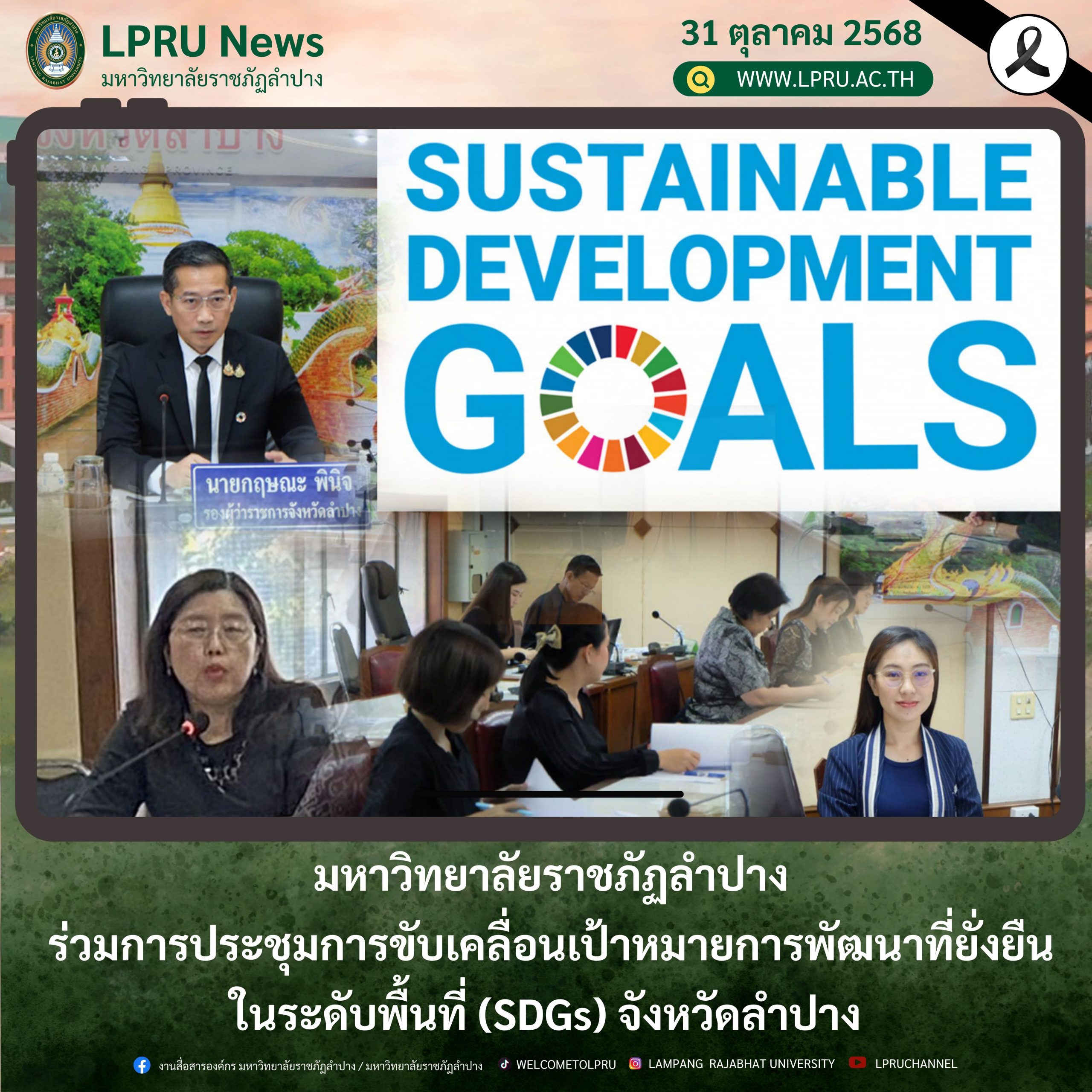 มหาวิทยาลัยราชภัฏลำปาง ร่วมการประชุมการขับเคลื่อนเป้าหมายการพัฒนาที่ยั่งยืน ในระดับพื้นที่ (SDGs) จังหวัดลำปาง Post navigation Previous: มหาวิทยาลัยราชภัฏลำปาง เข้าร่วมประชุมคณะกรรมการจัดงานฤดูหนาวและของดีนครลำปาง ประจำปี 2569Next: งานสถาบันภาษาและกิจการต่างประเทศ มร.ลป. พร้อมด้วย นศ.ชาวต่างชาติ จัดกิจกรรมจิตอาสาผลิตริบบิ้นผ้าถวายความอาลัยพระพันปีหลวง