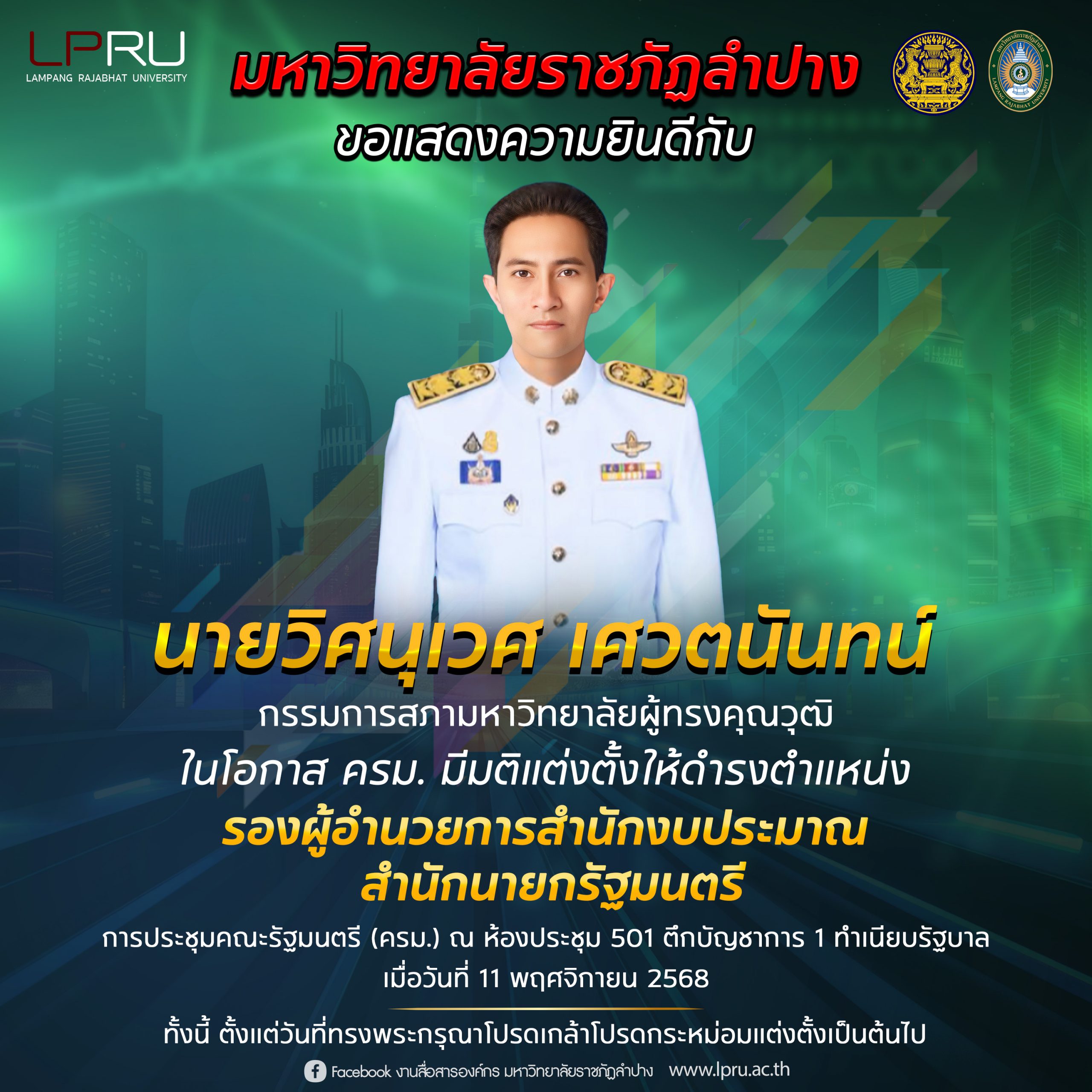 มหาวิทยาลัยราชภัฏลำปาง ขอแสดงความยินดีกับ นายวิศนุเวศ เศวตนันทน์ กรรมการสภามหาวิทยาลัยผู้ทรงคุณวุฒิ ในโอกาส ครม. มีมติแต่งตั้งให้ดำรงตำแหน่ง รองผู้อำนวยการสำนักงบประมาณ สำนักนายกรัฐมนตรี Post navigation Previous: มหาวิทยาลัยราชภัฏลำปาง รับถ้วยรางวัลพระราชทาน รางวัลที่ 2 ด้าน “ความถูกต้องเรียบร้อย/ การอ่านถูกต้องสม่ำเสมอ” ในการแข่งขันการเข้ารับพระราชทานปริญญาบัตร มหาวิทยาลัยราชภัฏเขตภาคเหนือNext: มร.ลป. ร่วมประชุมพิจารณาคัดเลือกสถานศึกษาวิชาทหารและผู้กำกับนักศึกษาวิชาทหารดีเด่น