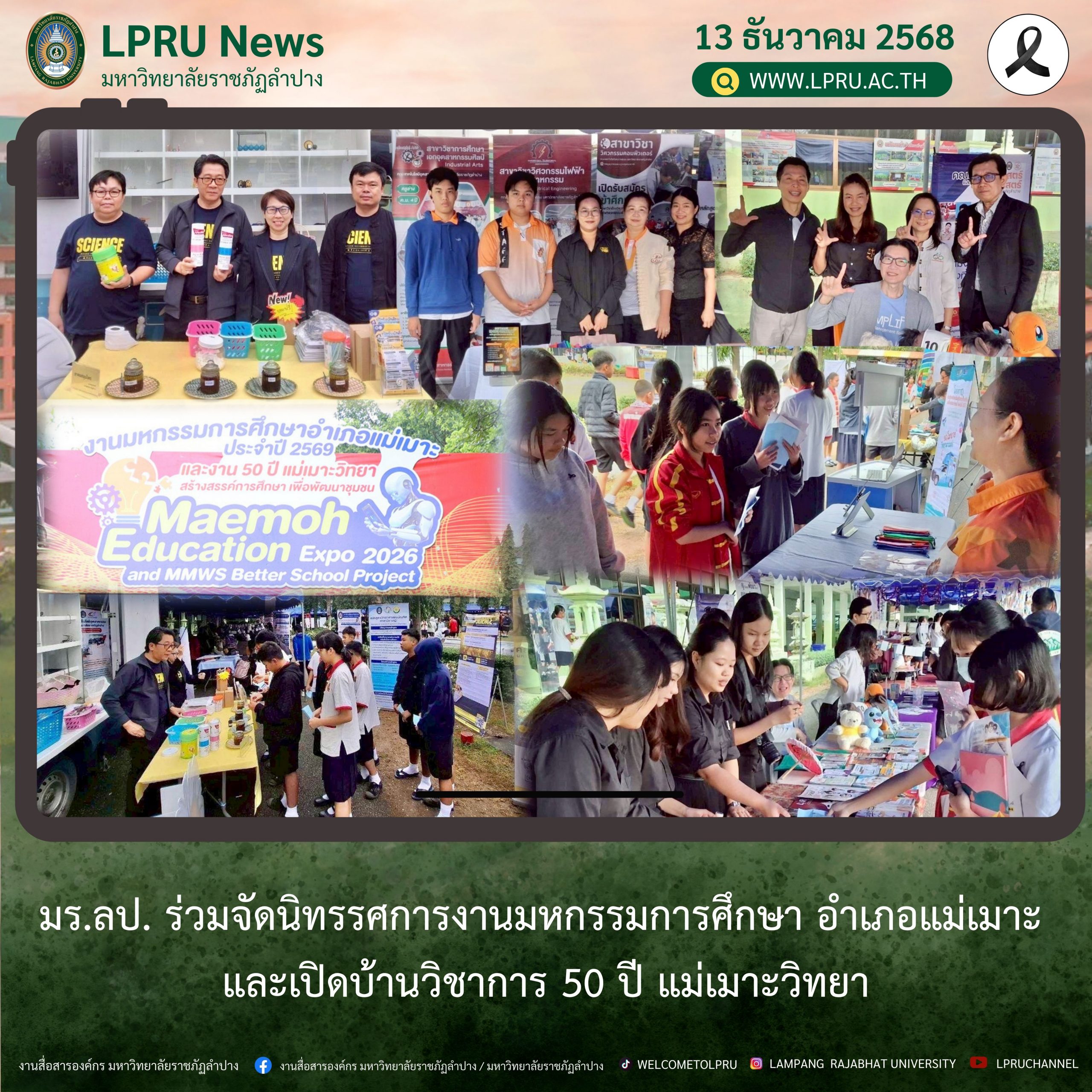 มร.ลป. ร่วมจัดนิทรรศการงานมหกรรมการศึกษา อำเภอแม่เมาะ และเปิดบ้านวิชาการ 50 ปี แม่เมาะวิทยา Post navigation Previous: คณาจารย์บุคลากร มร.ลป. ร่วมการแข่งขันกีฬาประเพณีบุคลากรมหาวิทยาลัยราชภัฏภาคเหนือ ครั้งที่ 5 “พิบูลเกมส์”Next: อาจารย์คณะครุศาสตร์ มร.ลป. เป็นวิทยากรโครงการสัมมนาเครือข่ายศูนย์บริการนักศึกษาพิการในระดับอุดมศึกษา ประจำปี 2568